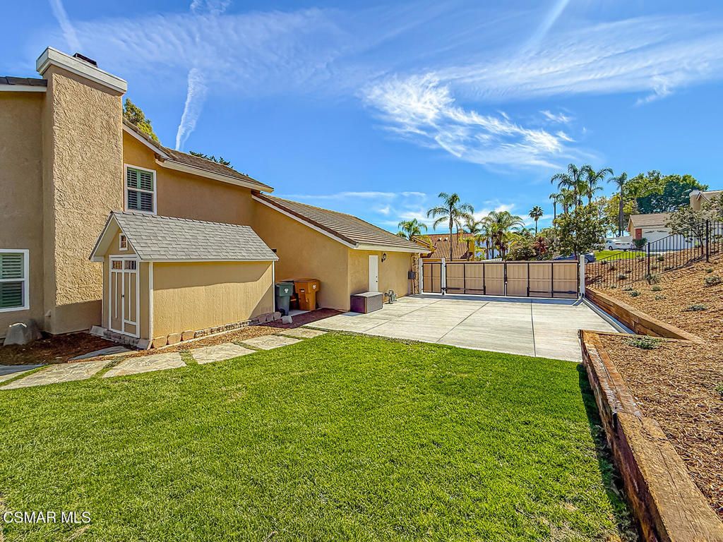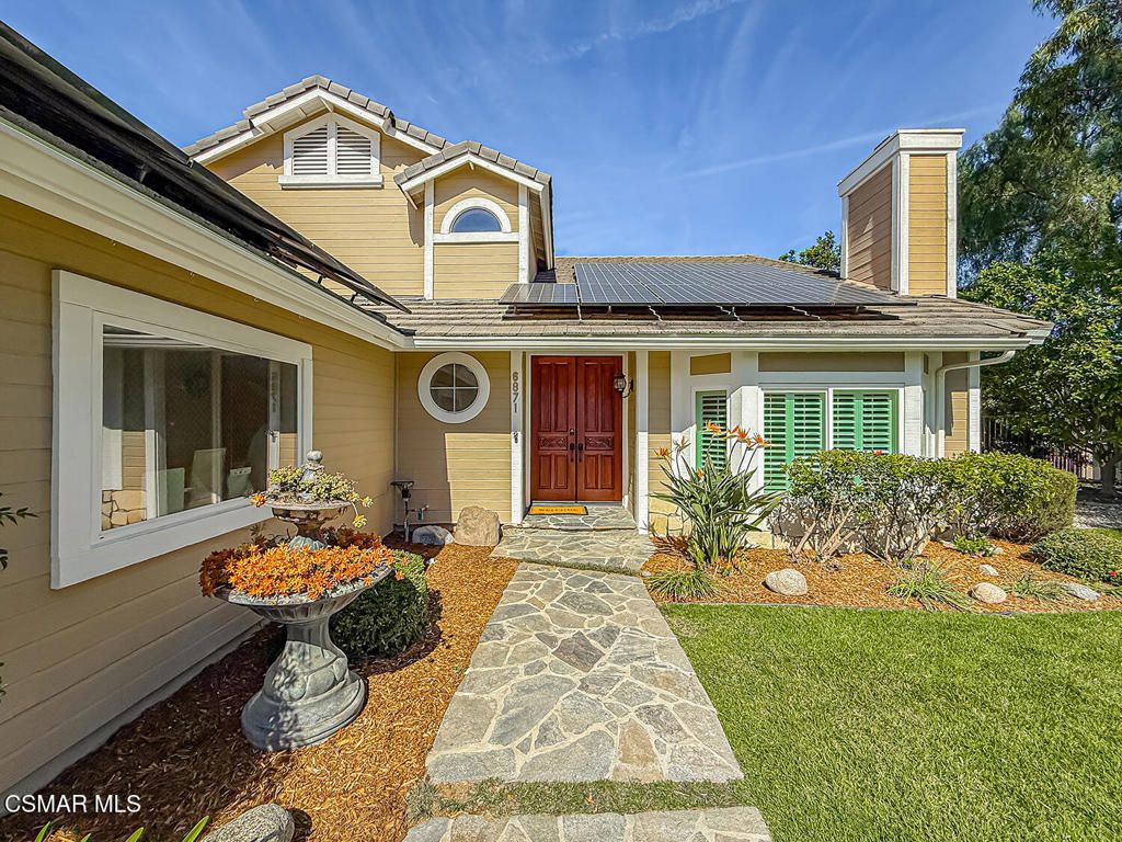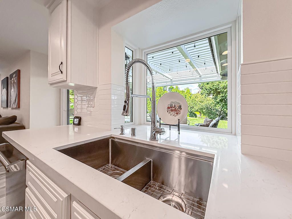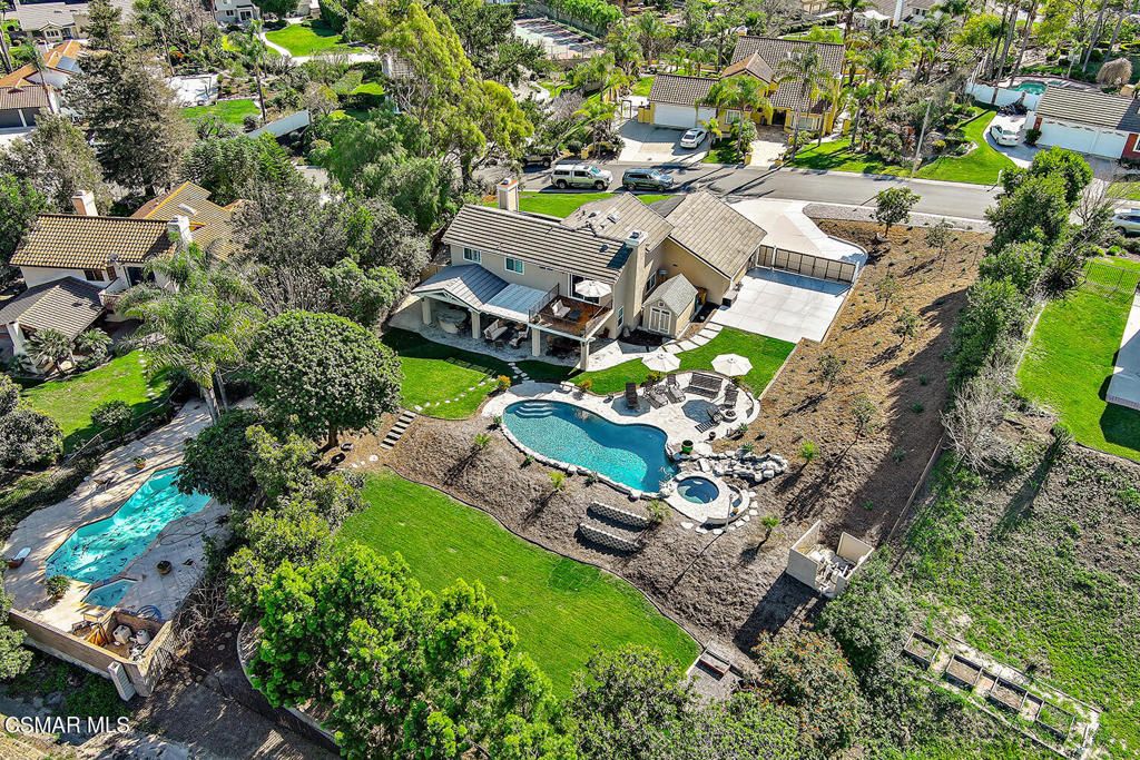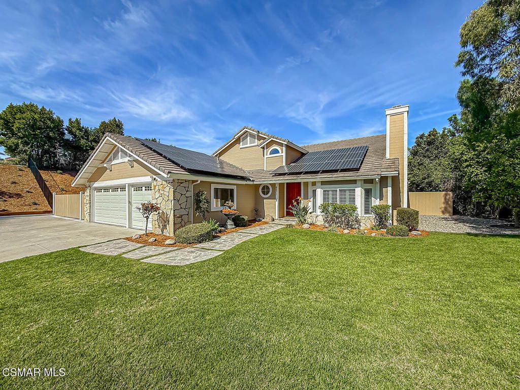 4BR/3BA home in Santa Rosa Valley, Camarillo. Heated pool and spa. 3-car garage. Remodeled kitchen and baths. Built 1988. No HOA. This 4 bedroom, 3 bath single family residence in Santa Rosa Valley, Camarillo offers 2,211 square feet on a 25,264 square foot lot with no HOA. Built in 1988 and updated throughout, the home includes a heated in-ground pool and spa, three-car attached garage, and RV access. Entry is ground level with no steps.The interior features an open floor plan with two story ceilings, recessed lighting, and wood-like flooring throughout. The refreshed kitchen includes quartz counters, a center island, greenhouse window, gas range, oven, microwave, dishwasher, garbage disposal, and refrigerator. The kitchen opens to the family room and formal dining area, creating connected living spaces. The living room has been brought to one level and includes a gas fireplace in the living room. A main floor bedroom and full bath add flexibility. Upstairs bathrooms include updated vanities, and the primary suite offers a walk-in closet and updated bath with double vanities, separate shower stall, and soaking tub.Major improvements include new tile backsplash, updated counters, partial roof replacement, new paint, double pane windows, plantation shutters, a new motorized gate, and new side yard landscaping. The home is on public sewer and district water with central A/C, ceiling fans, concrete slab foundation, and indoor laundry room.Outdoor features include a covered and open patio with stone finishes, landscaped front and rear yards with sprinkler system and timer, vinyl and wrought iron fencing, and a gated driveway with direct garage access. The pool and spa are filtered and heated.Located in the Marlborough 2 tract in Santa Rosa Valley, this property offers space, updates, and practical improvements on a large lot. Close of escrow possession. Zoned RE30AV.
