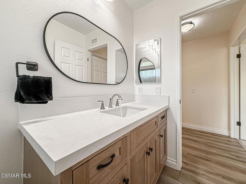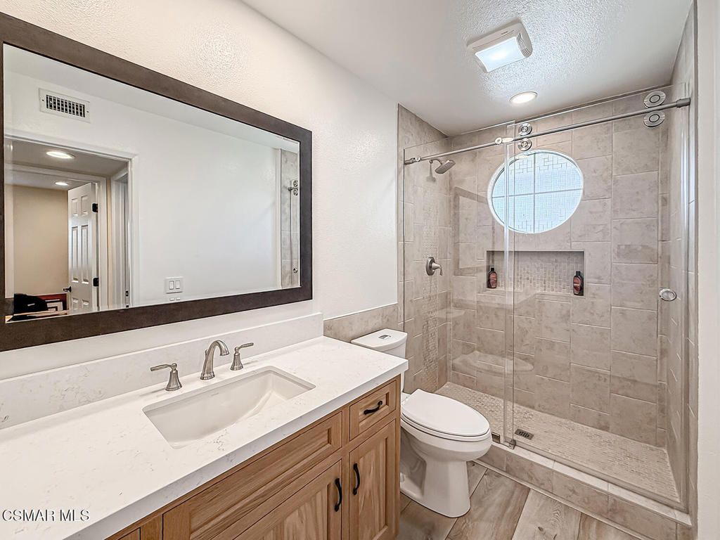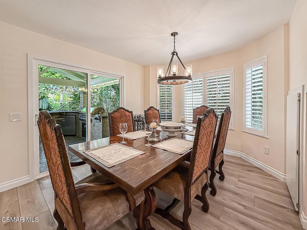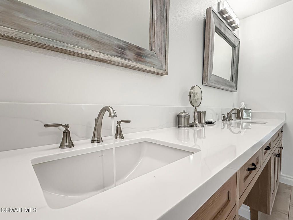 4BR/3BA home in Santa Rosa Valley, Camarillo. Heated pool and spa. 3-car garage. Remodeled kitchen and baths. Built 1988. No HOA. This 4 bedroom, 3 bath single family residence in Santa Rosa Valley, Camarillo offers 2,211 square feet on a 25,264 square foot lot with no HOA. Built in 1988 and updated throughout, the home includes a heated in-ground pool and spa, three-car attached garage, and RV access. Entry is ground level with no steps.The interior features an open floor plan with two story ceilings, recessed lighting, and wood-like flooring throughout. The refreshed kitchen includes quartz counters, a center island, greenhouse window, gas range, oven, microwave, dishwasher, garbage disposal, and refrigerator. The kitchen opens to the family room and formal dining area, creating connected living spaces. The living room has been brought to one level and includes a gas fireplace in the living room. A main floor bedroom and full bath add flexibility. Upstairs bathrooms include updated vanities, and the primary suite offers a walk-in closet and updated bath with double vanities, separate shower stall, and soaking tub.Major improvements include new tile backsplash, updated counters, partial roof replacement, new paint, double pane windows, plantation shutters, a new motorized gate, and new side yard landscaping. The home is on public sewer and district water with central A/C, ceiling fans, concrete slab foundation, and indoor laundry room.Outdoor features include a covered and open patio with stone finishes, landscaped front and rear yards with sprinkler system and timer, vinyl and wrought iron fencing, and a gated driveway with direct garage access. The pool and spa are filtered and heated.Located in the Marlborough 2 tract in Santa Rosa Valley, this property offers space, updates, and practical improvements on a large lot. Close of escrow possession. Zoned RE30AV.