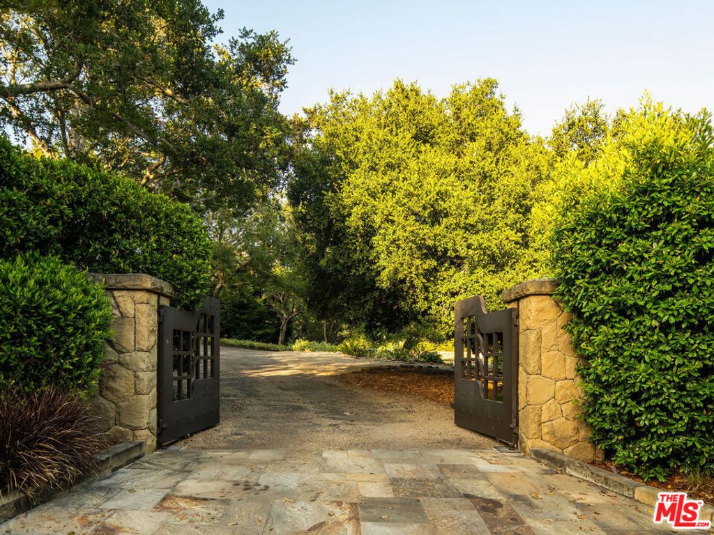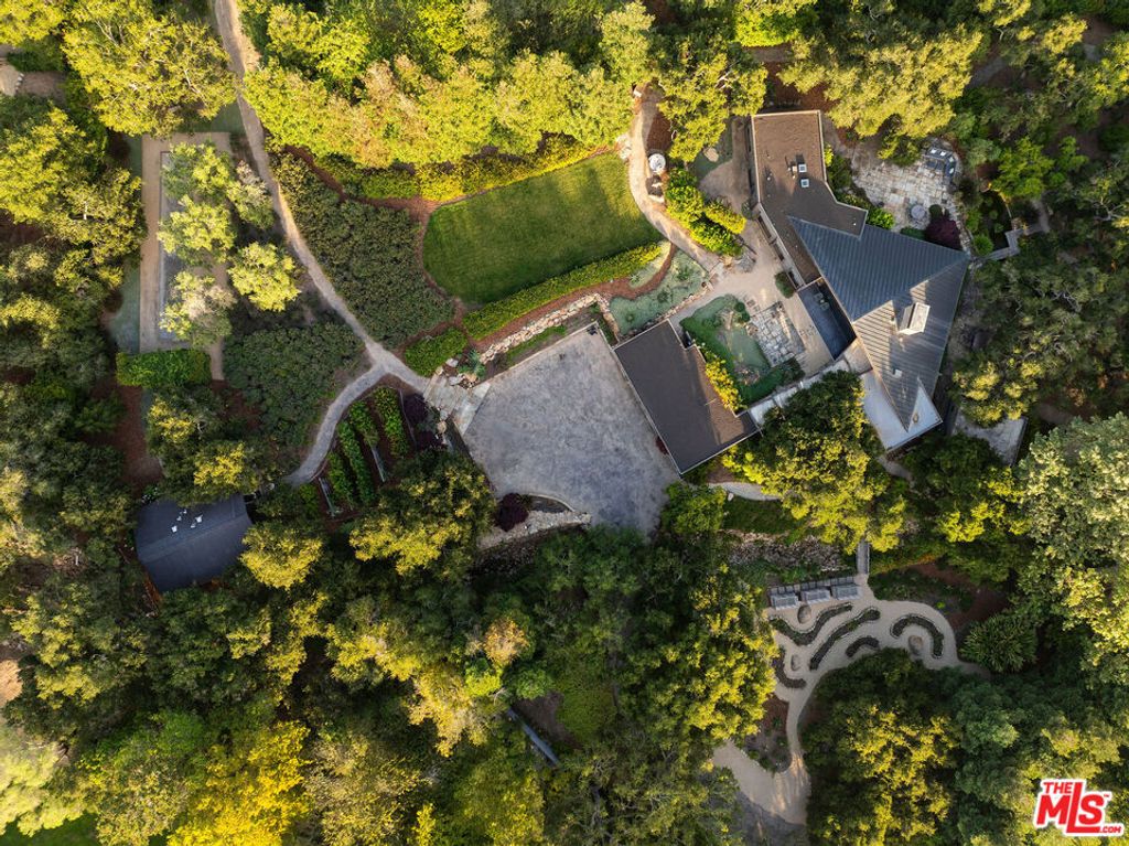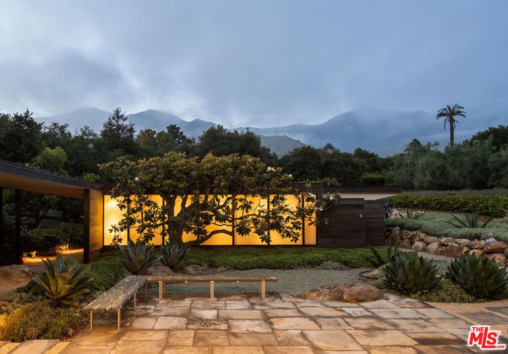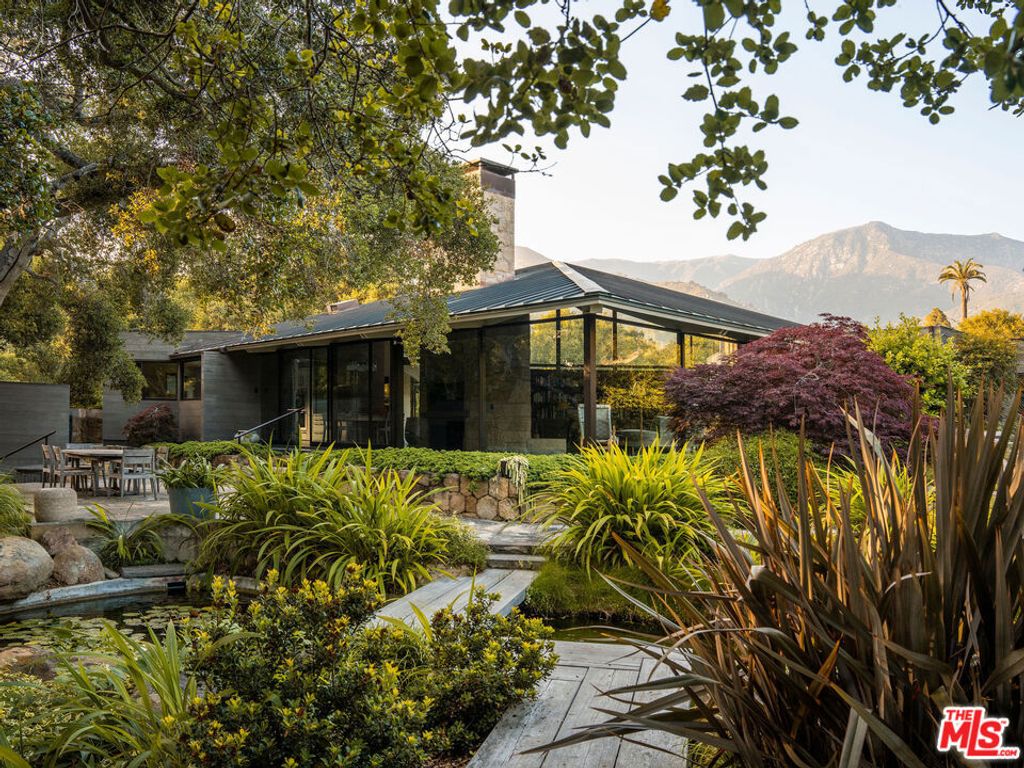 A rare midcentury modern architectural offering in the heart of Montecito, The Erving House, described as a "glass tent" by Time magazine in 1951,is a singular expression of architectural and landscape mastery, gracefully nestled on 2.7 acres of private, artfully curated grounds. Designed in 1950 by renowned architect Lutah Maria Riggs during her iconic modernist phase, and complemented by the legendary California landscape architect Thomas Church, this estate exemplifies the essence of indoor-outdoor living.Enter through private gates, where a meandering driveway weaves beneath a canopy of majestic oaks, setting a serene, cinematic approach to the residence. It culminates in a spacious motor court, where the home's striking flat-roof carport seamlessly marries form and function with timeless elegance.A covered walkway leads to the home's entrance, where a dramatic double-height foyer with floor-to-ceiling glass walls flood the space with natural light and frame expansive views of the surrounding landscape and mountains. This breathtaking entrance sets the tone for a home in constant dialogue with nature.The main living space unfolds with a soaring pitched ceiling, its apex seemingly reaching toward Montecito Peak, and a sculptural, biomorphic Santa Barbara stone fireplace, a subtle homage to Brazilian architect Oscar Niemeyer, Riggs' contemporary and collaborator. Walls of glass, both fixed and sliding, span the length of the room, opening to terraces and gardens and dissolving the boundaries between inside and out.The primary suite is a private retreat, featuring a spa-like bath, dual large dressing rooms, and tranquil views of the gardens and the coastal range. The home office offers inspiring solitude, framed by vistas of mature landscape and mountain ridgelines.The European-style kitchen is outfitted with custom Poggenpohl cabinetry and top-tier appliances, crafted with the serious chef in mind. The adjoining formal dining area also enjoys views of both the northern mountains and the home's terraced gardens and native flora beyond.Adjacent to the main house is a detached studio, providing flexible use, as a guest bedroom, creative workspace, or private retreat, its large windows revealing the natural beauty of mature oaks. Across the property is a serene 1-bedroom, 1-bath creekside guest house offering peaceful accommodations far enough from the main home to feel entirely its own.The grounds, once altered by previous owners,have been thoughtfully revived by landscape architect Susan Van Atta, who honored much of Church's original vision while adding her own artistry through native plantings. Wander through fruit orchards, lavender fields, and raised vegetable gardens, or enjoy a game at the bocce ball court, each element curated for both beauty, sustainability, and enjoyment.The Erving House is more than a residence, it is a living piece of architectural history and one of Montecito's most important homes. It offers unparalleled privacy, serenity, and a lifestyle that celebrates the seamless interplay between nature and design. Additional features include a high- functioning well with RO system for landscaping and a full power backup generator.