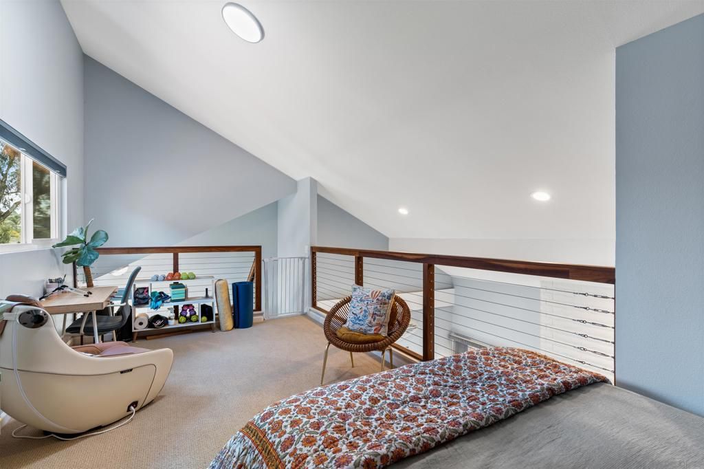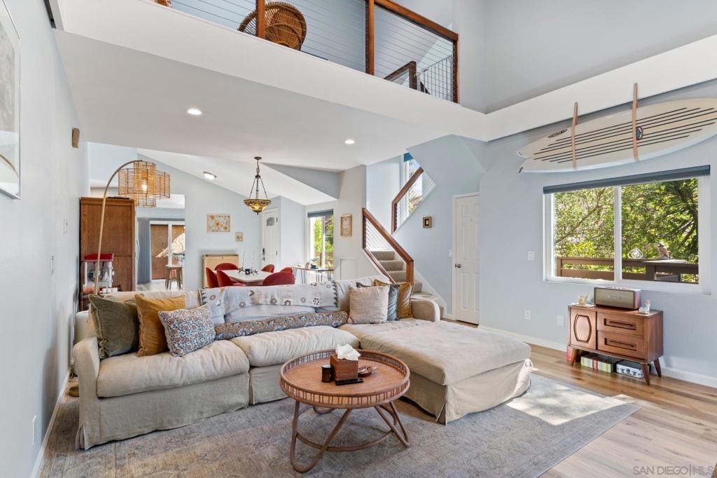 Nestled in a private, end-unit location in the highly sought-after Avenue of the Trees community. Surrounded by lush greenbelt & open space, the home lives like a single-level, with both primary & secondary bedrooms situated on the main floor. The upstairs loft with a WIC is an optional 3rd bedroom. The expansive living room showcases soaring vaulted ceilings, a cozy fireplace, abundant natural light, & seamless access to the patio. The updated interior features wide-plank luxury vinyl flooring, quartz countertops, stainless steel appliances, & modern lighting. The spacious primary suite includes a double vanity ensuite bath. Outdoors, enjoy a wraparound Trex deck enveloped by mature landscaping & peaceful nature views. With multiple seating areas across upper & lower deck spaces, plus a pre-plumbed gas line for a future firepit.. Additional upgrades include a powder-coated aluminum privacy fence and a recently updated roof with new underlayment & tiles. The owned solar system consistently offsets annual electricity costs & a recently installed high-efficiency Mitsubishi ducted heat pump system providing 3-zone heating & air conditioning. The full two-car garage offers ample storage, including overhead truss space, plus an additional dedicated parking space in front of the home. Residents enjoy HOA amenities including a pool, spa, & tennis courts, with a convenient walking path directly from the backyard to these features. Located West of El Camino Real, 1.5 miles from the beach, & quick access to Highways 78 and 5. Won't last.