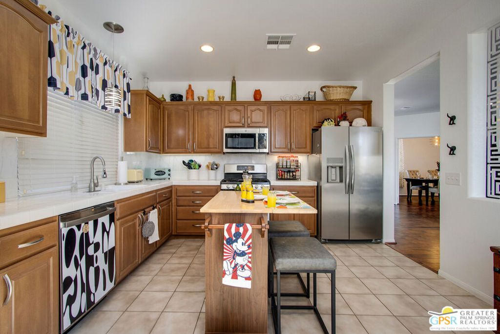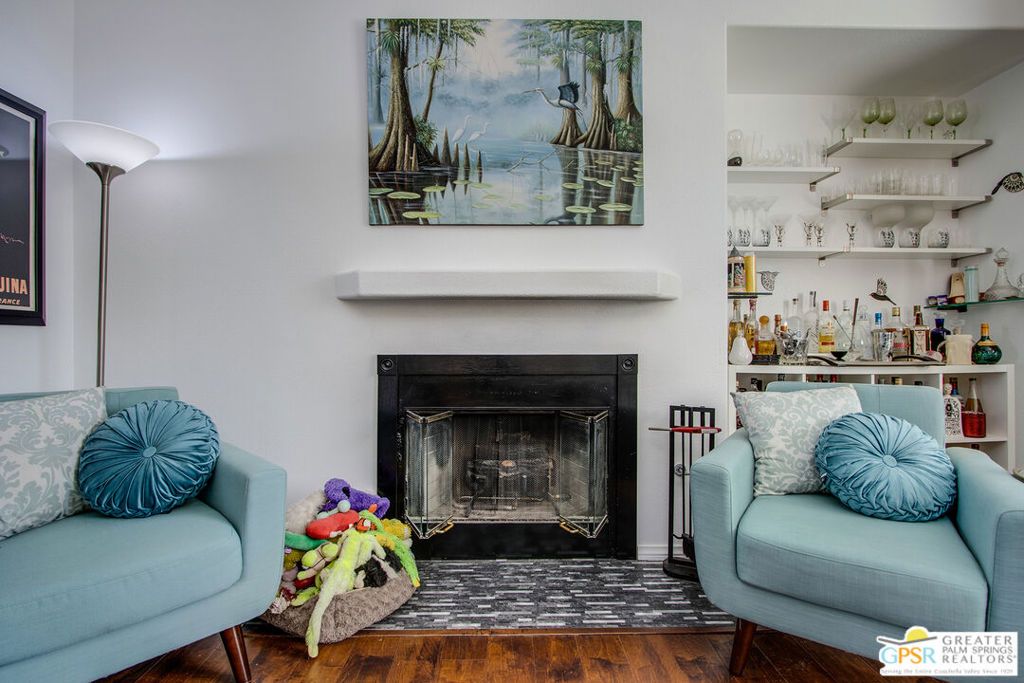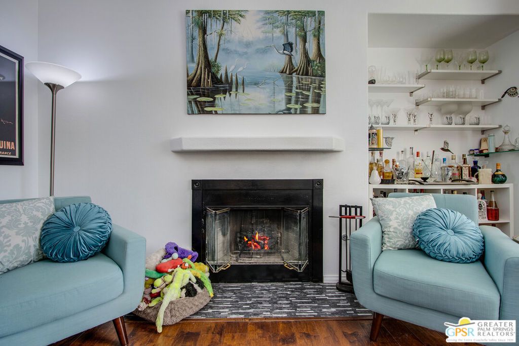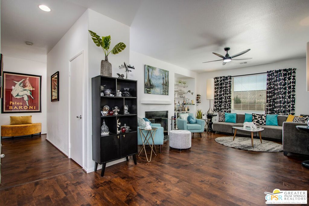 Welcome to this beautiful move-in ready 2-bedroom, 2-bath home located in the highly sought-after Desert Willows gated senior community. Enjoy stunning mountain views, breathtaking desert sunsets, and a peaceful, walkable neighborhood with a charming park nearby. Offering 1,396 sq. ft. of thoughtfully designed living space, this home features two spacious bedrooms plus a versatile home office, den, or potential third bedroom, along with two well-appointed bathrooms. The open floor plan includes 9-foot ceilings, a mix of laminate wood flooring and ceramic tile, and a cozy fireplace in the living room, creating a warm and inviting atmosphere. The kitchen is beautifully maintained with stainless steel appliances, ceramic tile countertops, and a stone backsplash. A sliding glass door opens to the backyard patio, where you can relax and enjoy the spectacular mountain views. Both the front and backyard patios provide ideal spaces for entertaining or unwinding in a serene desert setting, complemented by low-maintenance landscaping. The home also includes an attached garage and paid-for solar panels, with furniture negotiable. Residents of Desert Willows enjoy a vibrant lifestyle with low HOA dues and exceptional amenities, including a pool, spa, tennis and pickleball courts, fitness center, banquet facilities, and a beautiful small lake setting. All of this is conveniently located near shopping, dining, and everyday essentials. This welcoming community is designed for connection, comfort, and enjoyment. Come experience desert living at its best this home is truly move-in ready!