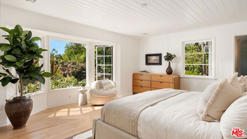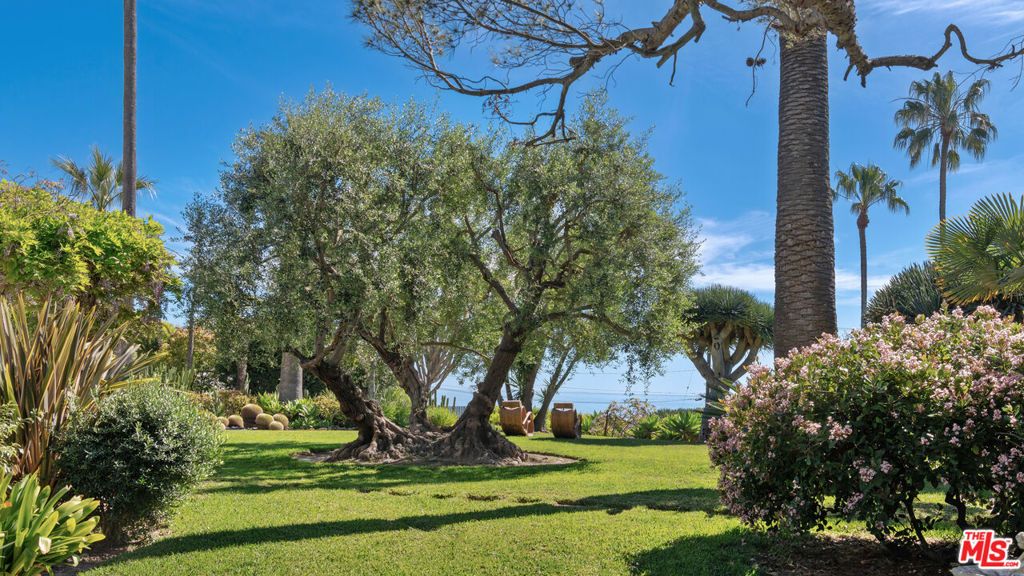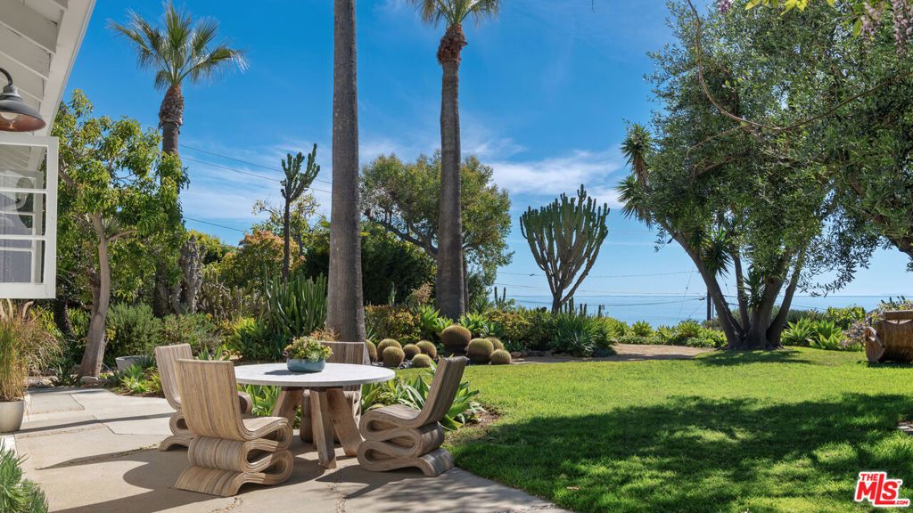 Tucked along a quiet stretch of Baden Place, this historic Malibu property offers rare privacy, charm, and sweeping ocean views on beautifully landscaped grounds. One of the area's original homesites, the main residence thoughtfully updated over time, blending classic coastal character with bright, airy living spaces designed for relaxed Malibu living.A gated driveway with generous parking welcomes you to the property, where a paver walkway and brick steps lead to a glass and wood entry door. Inside, the open floor plan is filled with natural light and anchored by warm wood floors and dramatic wood beam ceilings. The living room centers around a striking fireplace with wood mantel and stone hearth, while large windows frame surrounding greenery and ocean views beyond.The open living and dining spaces flow easily toward the backyard, creating a seamless connection between indoor comfort and outdoor entertaining. The dining area enjoys clear ocean views and opens directly to the patio and lawn. The nearby kitchen features granite countertops, KitchenAid appliances including a five burner range, extensive built-ins, and a breakfast area positioned beside French windows to capture ocean views. A nearby laundry room with stacked washer and dryer, utility sink, and Dutch door provides convenient access to the backyard and sunroom.The bedroom wing includes several light-filled bedrooms and baths, including a primary suite with ocean views, generous closet space, and an ensuite bath with tiled floors, vanity, shower, and soaking tub. Additional bedrooms feature wood floors, sliding glass doors, and easy access to outdoor areas, offering flexibility for guests, office space, or creative use.The grounds are truly the heart of the property. A spacious patio and expansive grassy lawn overlook Zuma's whitewater and the Pacific beyond, creating an exceptional setting for gatherings or quiet moments outdoors. The property is known for its remarkable gardens and mature specimen trees, including an 80 year old olive tree, macadamia nut trees, eucalyptus, yucca, palms, fig, and striking dragon's blood trees, along with extensive cactus and native plant gardens that give the landscape its distinctive character.A stone path winds through the gardens to a sizable two bedroom guest house with detached garage, offering additional living space ideal for visitors, extended family, or rental use. With its own address and driveway access from Baden Place, and mature landscaping providing natural separation, the guest residence offers a true sense of independence from the main home.With only four owners in its history, this special Malibu property presents a rare opportunity to own a piece of Malibu's heritage, offering timeless character, exceptional gardens, and beautiful ocean views in a uniquely private setting.