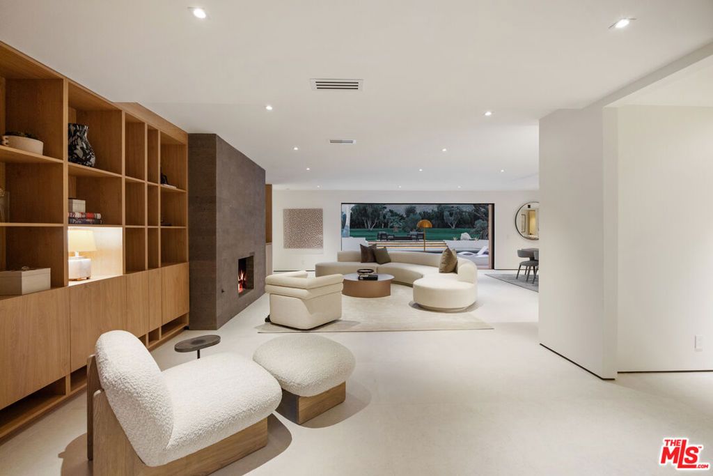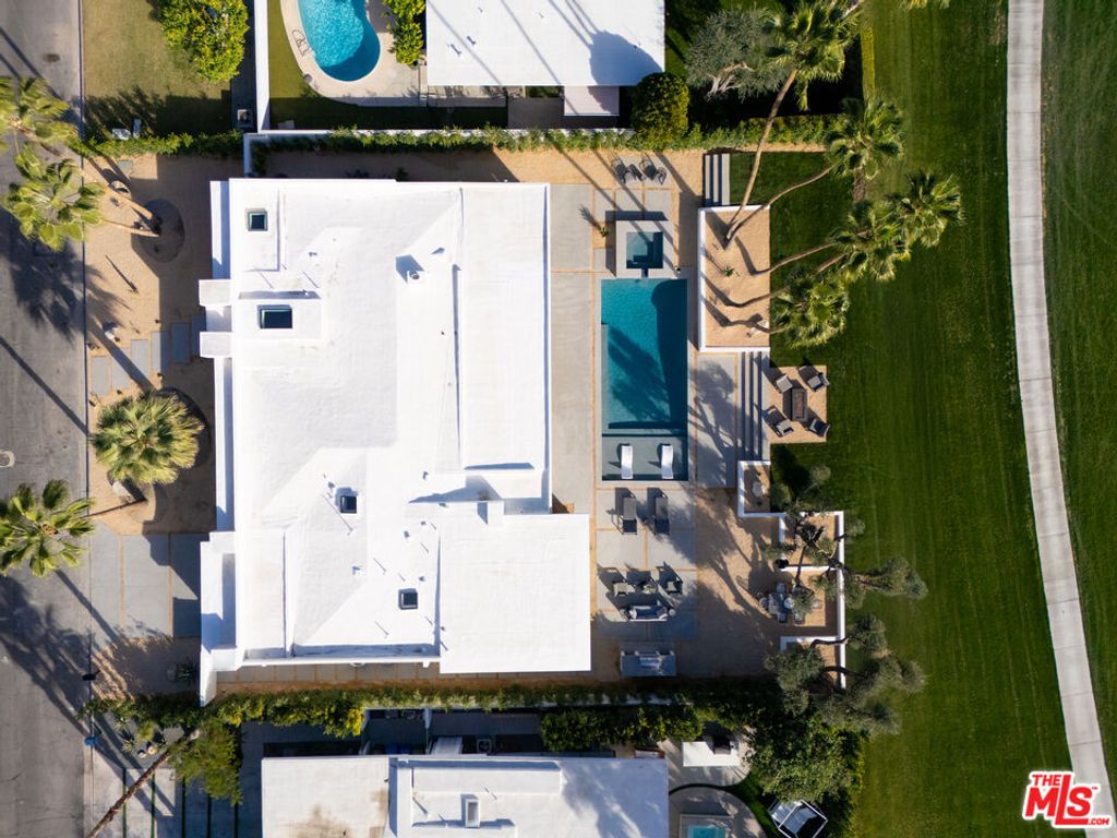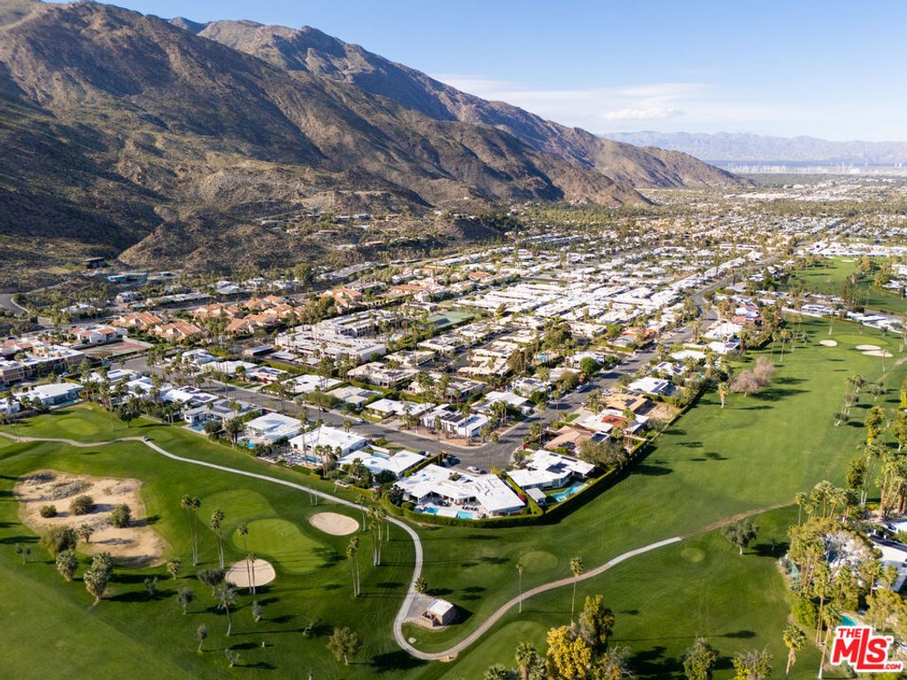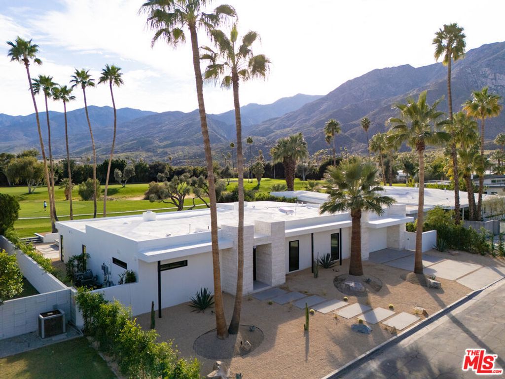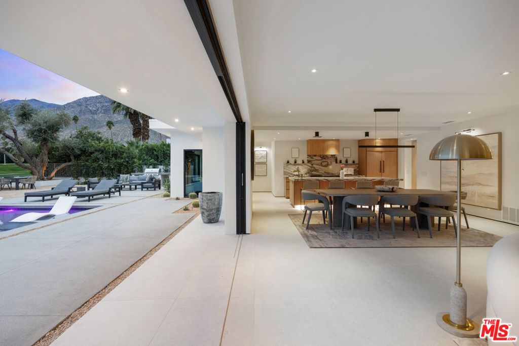 Located within the coveted Indian Canyons enclave of Palm Springs, this newly reimagined residence occupies an exceptional golf course setting with sweeping views of the San Jacinto Mountains. Reconstructed through a comprehensive 12-month renovation, the four-bedroom, four-bath home showcases a refined material palette of warm natural elements and pocketing glass walls that seamlessly extend the light-filled living spaces into the surrounding desert landscape. A dramatic glass pivot entry opens to a main living area anchored by a striking volcanic stone fireplace, complemented by solid oak doors, custom oak cabinetry, and skylights that infuse the space with an inviting ambient glow. The home's culinary centerpiece is a chef's kitchen appointed with a full Dacor appliance suite, including a 48-inch professional range, dual dishwashers, and integrated Sub-Zero refrigeration and ice maker. Distinctive marble and rare quartzite surfaces lend an elevated aesthetic, while a walk-in pantry elevates both function and presentation. Spa-inspired bathrooms feature indoor succulent garden shower elements. An entertaining bar finished in rare, striking marble incorporates built-in wine refrigeration, serving as a visual focal point within the main living areas. Each of the two primary suites features spacious custom walk-in closets, while subtle under-cabinet and wardrobe illumination creates a warm, inviting ambiance throughout. Outdoor living is thoughtfully designed for entertaining, with a secured front-yard approach transitioning to a backyard that opens directly to the golf course for uninterrupted fairway and mountain views. Mature palm and olive trees frame multiple lounge and fire-feature areas, enhanced by dramatic evening landscape lighting. The resort-style pool features a dive-worthy deep end, expansive sun shelf, and an elevated spa with cascading waterfall. Indian Canyons remains one of Palm Springs' most coveted residential enclaves, prized for its expansive golf course vistas, architectural pedigree, and peaceful atmosphere at the base of the San Jacinto Mountains. Life here is centered around the outdoors- morning walks beneath towering palms, quick access to the Coachella Valley's most celebrated hiking trails, and effortless bike rides into downtown Palm Springs for dining, galleries, and nightlife. Anchoring the neighborhood is the renowned Indian Canyons Golf Resort, widely considered one of the most beautiful and iconic golf settings in the city.