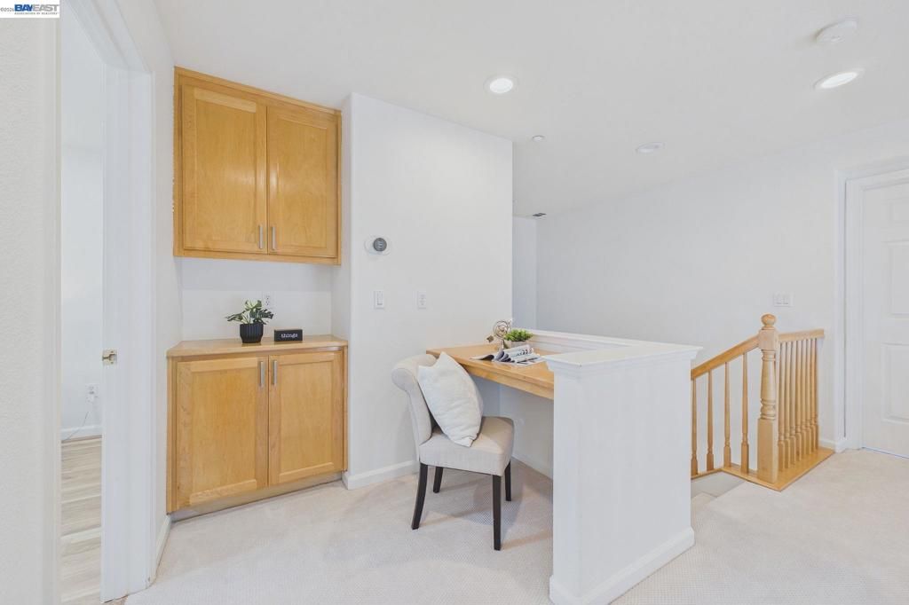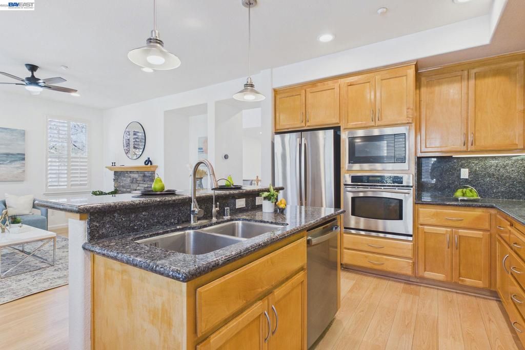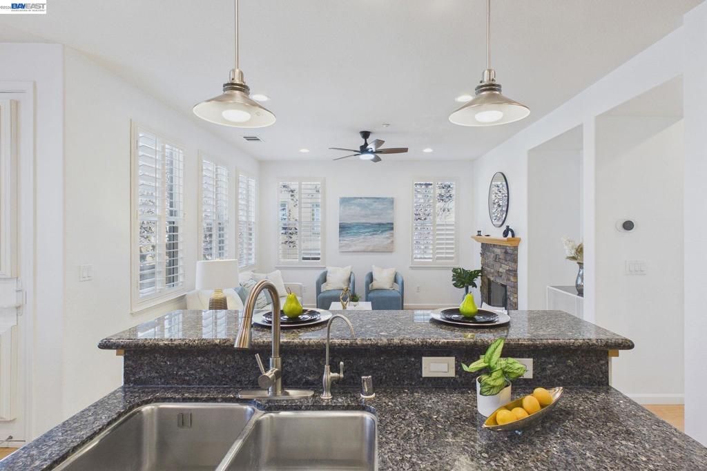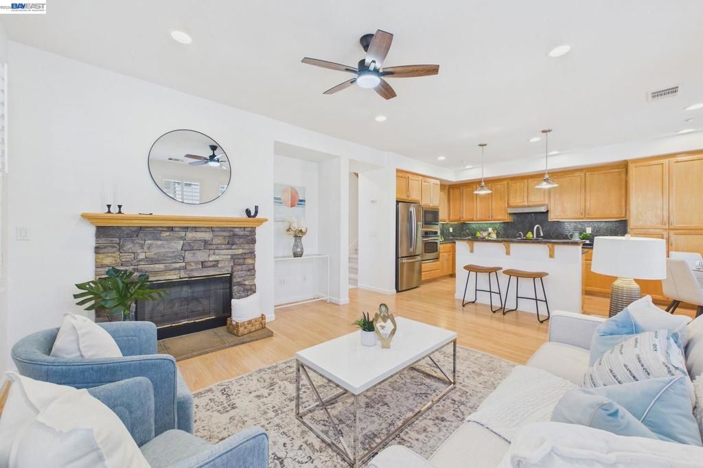 Welcome to this East Facing, Townhouse style, condo in the highly coveted Ambridge community of Windemere. This rarely available Corner Lot showcases Plantation Shutters & Laminate wood Floors. Greeted w/Soaring Ceilings & Formal Living Room upon entry, the main level also offers a highly sought-after bedroom & full bath. This modern floor plan features Formal Dining Room, & Family Room w/Gas Fireplace w/custom mantle. The Kitchen features Granite Countertops & Backsplash, Bar seating at Island, Stainless Steel Appliances & Breakfast Nook w/access to Private Patio. The upstairs level leads you to the Primary Suite w/Gorgeous ensuite bath offering a walk-in closet, Marble tile surfaces, 2 sinks, Stall shower & Soaking tub. This level also includes a Designated workspace in the hallway w/two secondary bedrooms & shared Full bath with tub. Laundry Room w/Ample Cabinets & Counter space. Attached two car garage equipped with 240EV charging capability. Featuring modern conveniences such as a water softener, a reverse osmosis system for purified drinking water. Walking Distance to HOA community Pool. Located near Top-Rated San Ramon schools, Easy access to Shopping/Dining, Parks & Hiking trails!