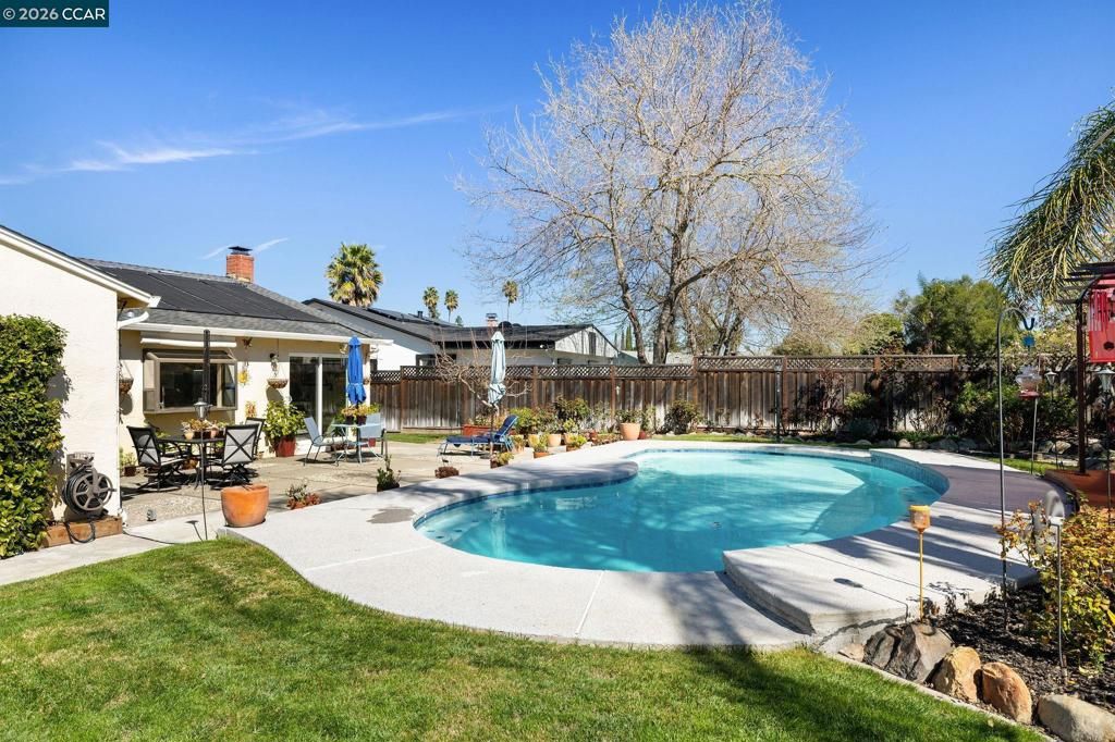 OPEN HOUSE! 3/7 1-4PM and 3/8 1-4PM This 4-bedroom, 2-bathroom home sits on a large 8,144 sq. ft. lot with a major bonus: no neighbors behind you. The backyard has a resort feel with tropical landscaping, offering total privacy. Inside, the layout is open and flexible, featuring wood floors throughout the main areas and durable tile in the kitchen. The kitchen and family room are the heart of the home, filled with natural light from a large picture window and sliding door that look out to the yard. The kitchen has granite countertops and a breakfast bar, and it opens right into a family room with a brick fireplace"”making it an easy space for entertaining. At the front of the house, there's a bright living room off the entry and a wide covered porch perfect for relaxing. The home includes modern recessed lighting and three good-sized bedrooms, one of which works great as an office. The primary suite is large and has two separate closets. Complete with a paver stone driveway, the home is close to sports parks, shopping, and top-rated Pleasanton schools. It's a practical, well-located home in a quiet setting.