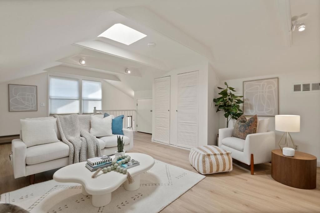 Welcome to this enchanting Belmont retreat where charm, serenity & thoughtful design come together beautifully. Tucked behind lush landscaping, this updated 3-beds, 3-baths + office residence offers 2 spacious en-suite bedrooms, 1 on the main level and 1 upstairs, providing excellent flexibility for guests or multi-generational living. Formal entry leads to the light-filled living/dining area featuring exposed beam ceilings, built-in display cabinetry, classic fireplace, and large windows. The inviting kitchen showcases soft sage cabinetry, quartz countertops, stainless-steel appliances, and a charming eat-in nook. The generous main-level primary suite with incredibly spacious closet and spa-inspired bath easily accommodates a sitting area and opens to the backyard through French doors. Also on the main level are a spacious secondary bedrm, home office & beautifully remodeled hallway bath with designer tiles, brass finishes, and dramatic skylight. Upstairs, a large family room with exposed beams and skylights accompanies the second en-suite bedroom with full bath. The backyard offers a large entertaining deck, expansive lawn, mature trees including a striking redwood, and a garden shed. It is conveniently located near parks, trails, shopping, dining, and easy access to 101 & 280.