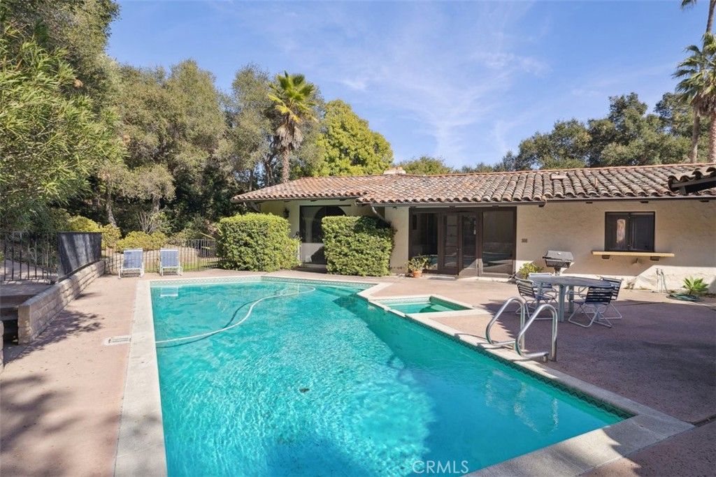 Outside, the property feels like a private retreat. A sparkling pool and spa are surrounded by patios, shaded sitting areas, and established gardens. The gently sloping lot allows room for potential expansion, such as a guesthouse, ADU, or enhanced outdoor living spaces. A three-car attached garage and broad motor court add convenience and ample parking.