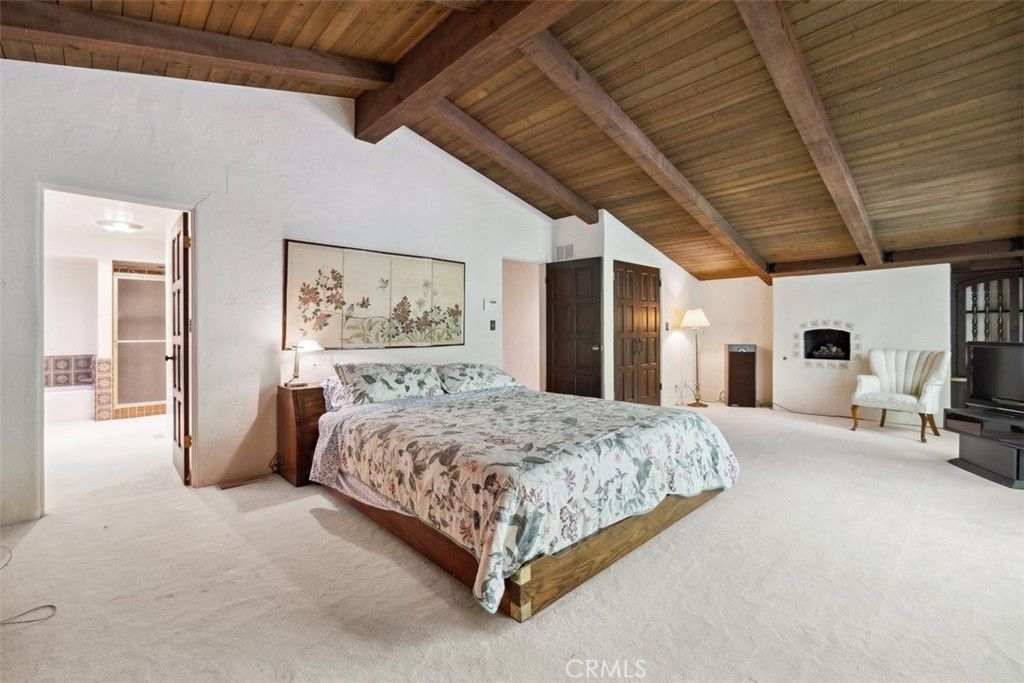 The residence includes five bedrooms and four and a half baths, thoughtfully designed for privacy and easy flow. The primary suite enjoys vaulted ceilings, a generous en-suite bath, and views of the surrounding landscape. Several guest bedrooms open directly to the outdoors, creating flexibility for multi-generational living, guest quarters, or work-from-home setups. Throughout the interior, original details and quality construction offer a strong foundation for personalization and updates.