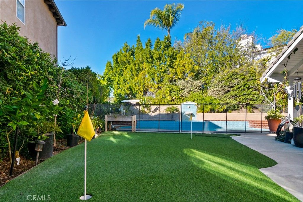 The backyard is designed for both relaxation and recreation, featuring a swimming pool and spa, putting green, multiple lawn areas, a fountain, and a covered patio for outdoor dining and gatherings.
