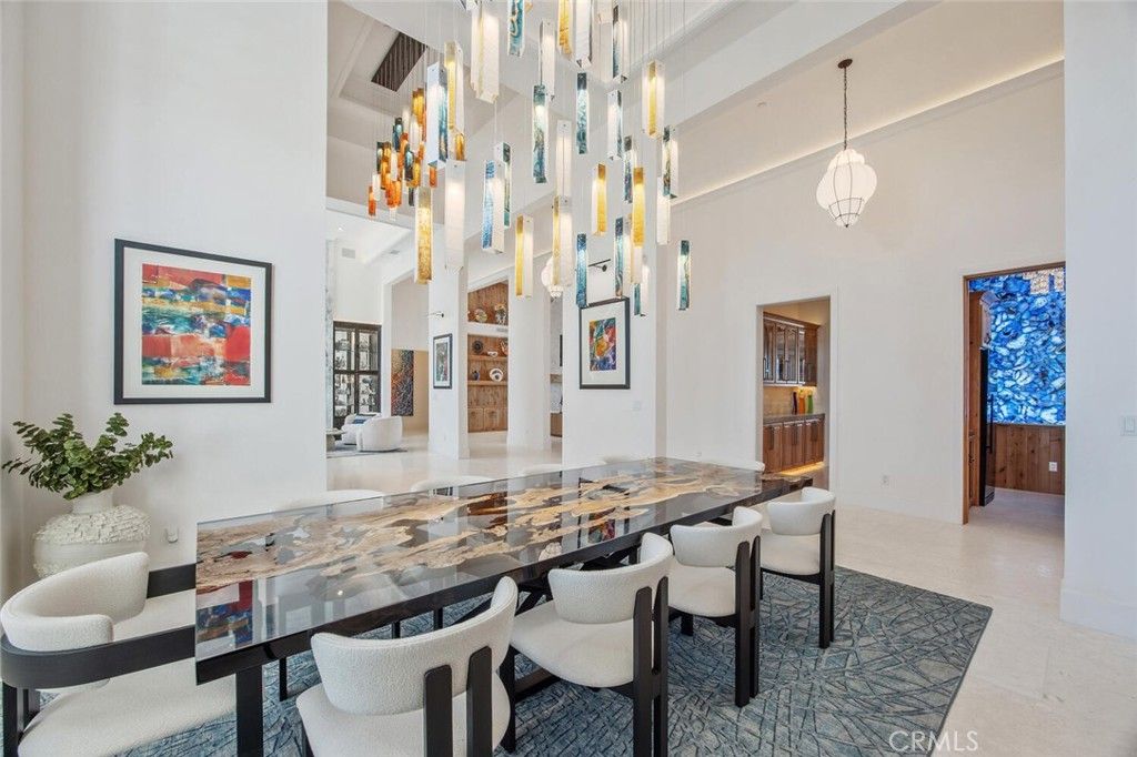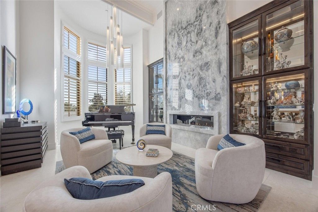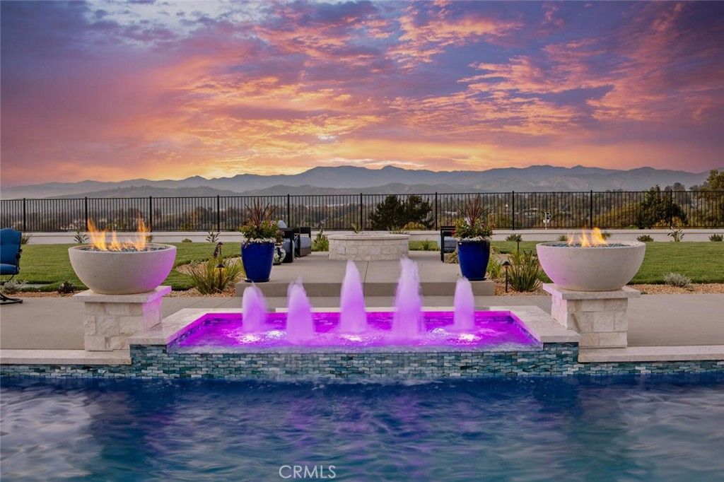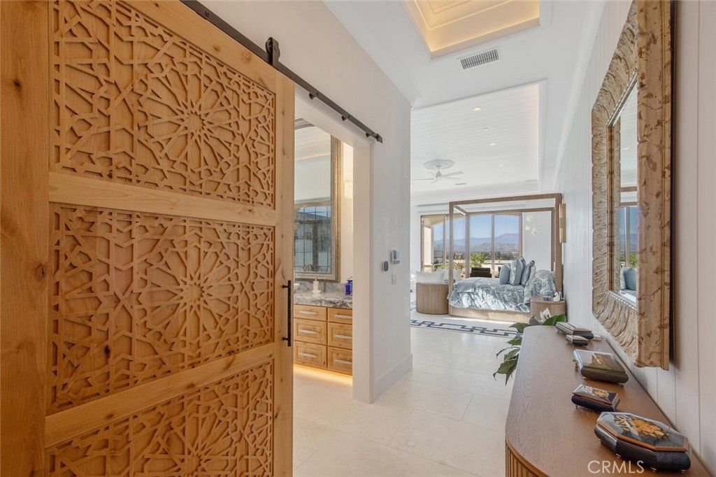 Completed in 2025, this single-story architectural residence is set on approximately one acre of gated grounds, blending panoramic views with refined design and resort-caliber living. A dramatic foyer introduces Turkish white limestone floors, hand-applied Venetian plaster walls, and a sculptural multi-tier chandelier. Beyond, the great room soars to 26-foot ceilings with a limestone fireplace and expansive 20-foot disappearing nano doors that dissolve the boundary between interior and exterior living. The turret-style living room is framed by 12-foot windows and anchored by a striking quartzite fireplace, while the formal dining room features custom built-ins and designer lighting. The chef's kitchen impresses with 15'6" ceilings, custom knotty alder cabinetry, dual navy-stained islands, quartzite countertops, premium appliances, and an adjoining circular breakfast nook. A fully equipped prep kitchen, Butler's Pantry, and concealed walk-in pantry ensure effortless entertaining. The wine room is a statement piece, clad in backlit gemstone slabs with custom alder racking and a 70-bottle refrigerator. A 50-foot gallery hallway leads to a show-stopping powder room and into thoughtfully designed private spaces, including a tiered theater with 140-inch screen and full bar, and a sophisticated study with quartzite fireplace and French doors opening to a secluded patio. Three secondary bedroom suites feature bespoke finishes and private baths, with one currently styled as a gym overlooking pool and mountain views. The primary suite is a retreat of its own, complete with fireplace, nano doors to the yard, dual custom walk-in closets, and a spa-inspired bath offering a sculptural soaking tub, quartzite vanities, and an oversized backlit quartzite steam shower. Outside, the gated motor court with permeable pavers leads to an oversized three-car garage. The resort-style grounds showcase a covered patio with wood-paneled ceiling, stone fireplace, and outdoor kitchen. The beach-entry pool features a 10-foot spa, waterfall, fire bowls, and tranquil fountain, complimented by designer pavers. A detached casita offers complete privacy with limestone floors, a full kitchen, bedroom suite, designer bath, and covered patio with quartzite bar. An extraordinary estate blending architectural presence, refined craftsmanship, and resort-caliber amenities.