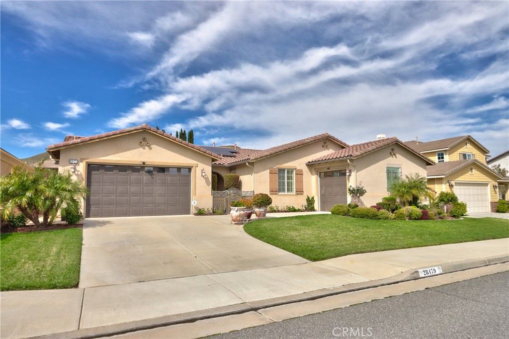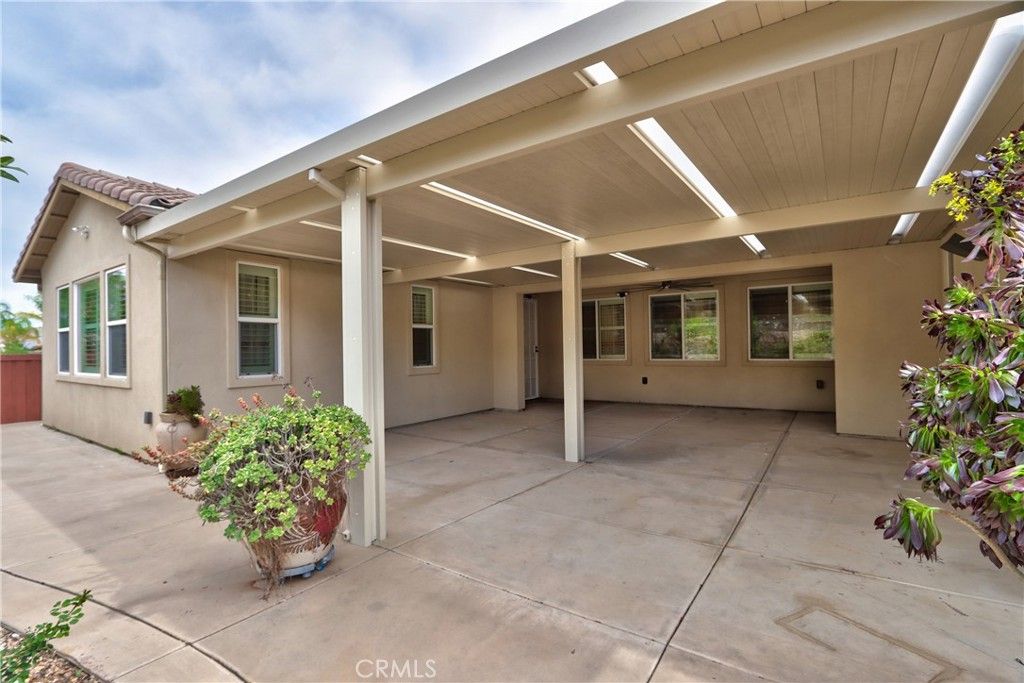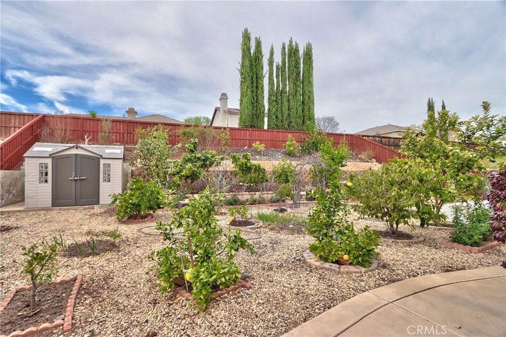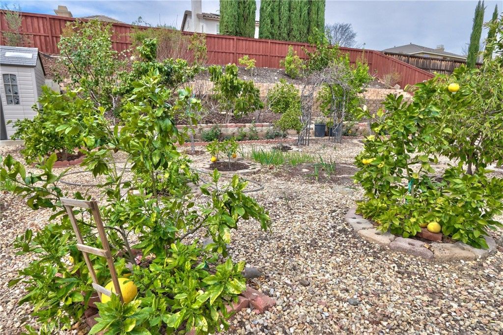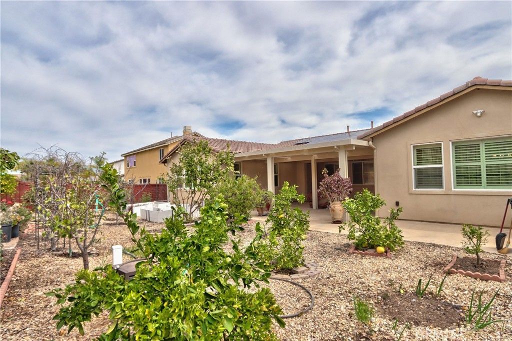 The single-story home of your dreams, first time on the market! Higher-end built-ins in the dining and family room, to hold your family treasures. OWNED SOLAR (36 PANELS) with two battery backups to keep your electricity low! Custom window shutters and drapery; beautiful stone flooring throughout the house, with carpet in the bedrooms; a home theater in the family room with surround sound that will stay with the home, and a large TV in the built-in, so you're movie night-ready the minute you move in. Bring extended family, as there are two separate garages with direct access to the house, and four large bedrooms. The back patio has a large vinyl cover, so no maintenance, and lots of shade while you take a break from eating the fruit from the 50 exotic fruit trees in the backyard. Please see supplements for a full list of the trees.