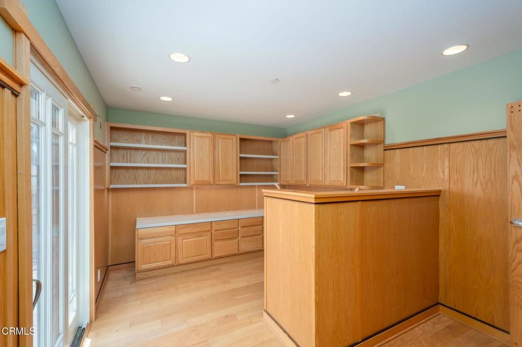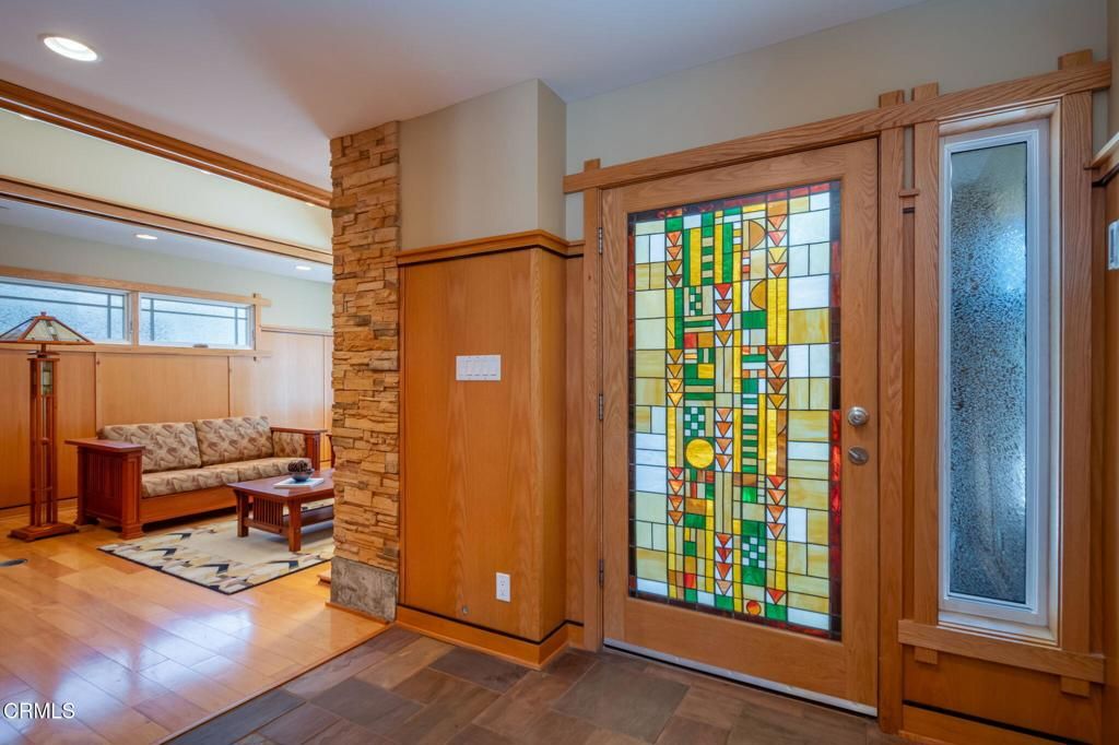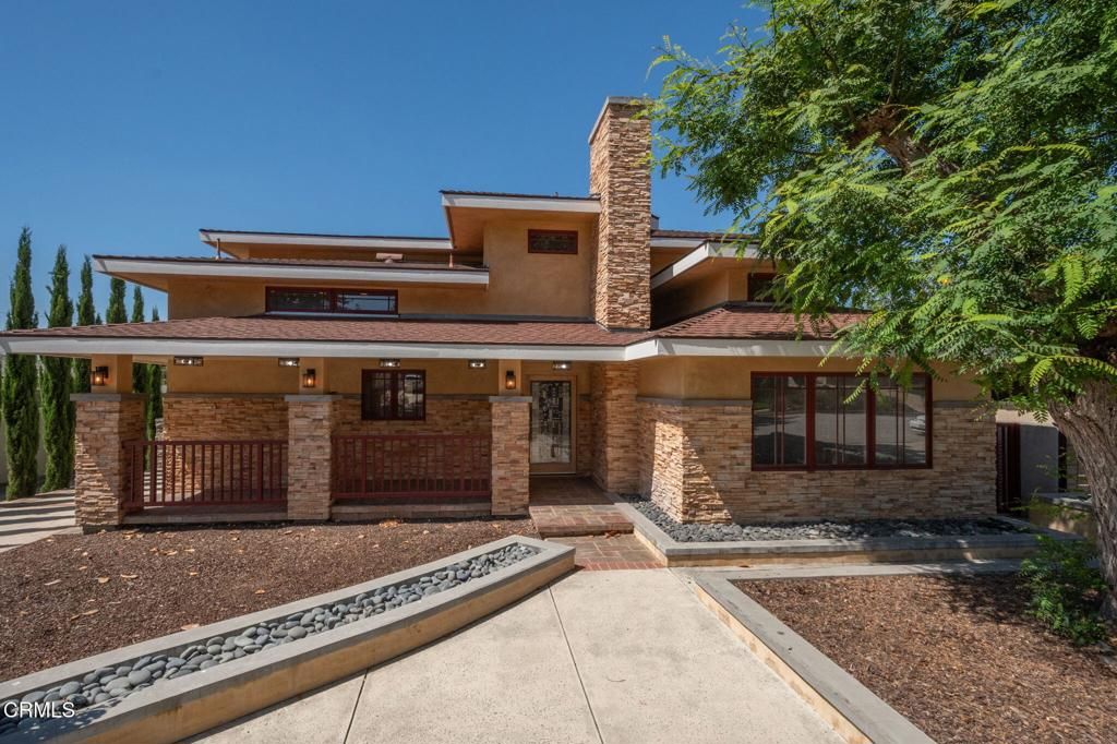 Architecturally striking and rich with character, 251 Palomares is a rare prairie-style residence that blends timeless design with modern comfort. It was built new to reflect the era. Tall, wide and straight is evident throughout including the work of a master carpenter.Strong horizontal rooflines, stacked stonework, and custom lighting create a dramatic first impression, while stained-glass details and warm wood accents carry the artistry indoors.The entry opens to a thoughtful floor plan anchored by a stone fireplace framed with hand-crafted stained glass and elegant wood paneling throughout. Every detail has been carefully planned -- from the slate stone flooring to the custom light fixtures that add depth and warmth to each room.At the heart of the home, the chef's kitchen stands out with high-end appliances, abundant cabinetry, and generous prep space designed for both everyday living and entertaining. Upstairs, the grand primary suite offers a private retreat with a south-facing balcony, perfect for enjoying natural light and Ventura breezes. On the main level, a separate suite currently set as a private office provides flexibility for remote work or guest accommodations.Step outside to a spacious backyard deck surrounded by low-maintenance landscaping and hardscaping, ideal for gatherings or quiet moments at home. With its northeast-facing frontage, the home captures soft morning light while staying cool in the afternoons.From the custom wrought iron accents to the intentional architectural flow, 251 Palomares is more than a home -- it's a statement of design, craftsmanship, and California coastal living.