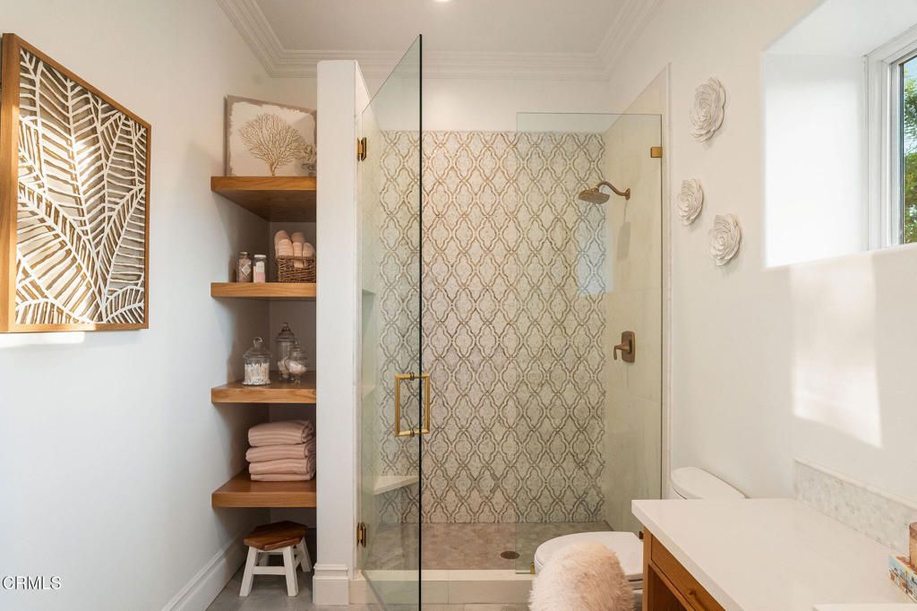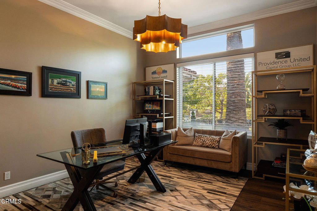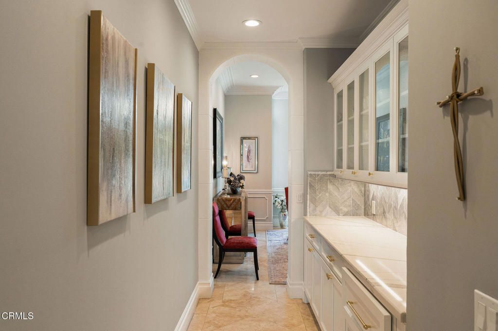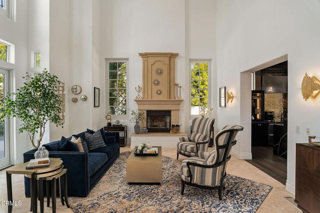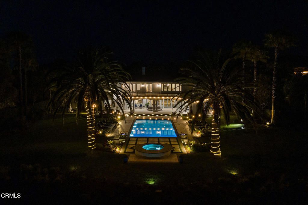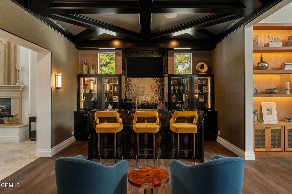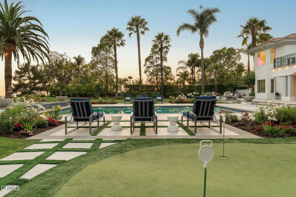Tucked away in Camarillo's coveted Spanish Hills community and perched on the 15th fairway of the Spanish Hills Club, 1069 Corte Barroso sits on one of the best lots in the neighborhood. This grand 7,121 SF contemporary estate on a flat, lush 1-acre lot features 6 bedrooms, 6.5 bathrooms, and a fully gated entrance offering premier privacy and exclusivity. Panoramic golf course and ocean views elevate everyday living in this beautifully designed residence that blends rich textures, clean lines, and luxurious scale. A dramatic formal entry welcomes you into voluminous interiors, where a soaring great room with a stone fireplace and oversized windows creates an elegant yet inviting space for gathering. The fully renovated and expanded kitchen is a chef's dream, outfitted with paneled Sub-Zero and Asko appliances, Wolf double ovens, induction + gas cooktop, microwave, two warming drawers, a large island with breakfast bar, dining area, built-in desk, and separate scullery. Oversized windows and a wall of French doors frame the serene outdoor space, enhancing the seamless indoor-outdoor flow. Flanking the entry are formal living and dining rooms, while the true showpiece downstairs is a moody, speakeasy-style bar with mini fridges, ice machine, oversized wine fridge, and custom woodwork. The main level also includes a spacious primary suite, laundry room, and an additional bedroom converted into a stunning office with custom cabinetry. Upstairs, a second expansive primary suite offers a large sleeping area, sitting room, modern electric fireplace, and French doors that open to a private terrace with jaw-dropping 180-degree views of Camarillo, the golf course, airport, and the Channel Islands--where sunsets are a daily highlight. Three additional guest bedrooms upstairs each feature ensuite baths for optimal comfort. The entertainer's backyard features lush, meticulously landscaped grounds, a renovated pool and spa, covered patio with built-in speakers, TV lounge with fireplace, full outdoor kitchen, putting green, and separate fire pit area. With an oversized 3-car garage, Tesla wall, owned solar and water purification systems, RV parking, and a truly unbeatable location, this estate is a rare offering and an exceptional place to call home.