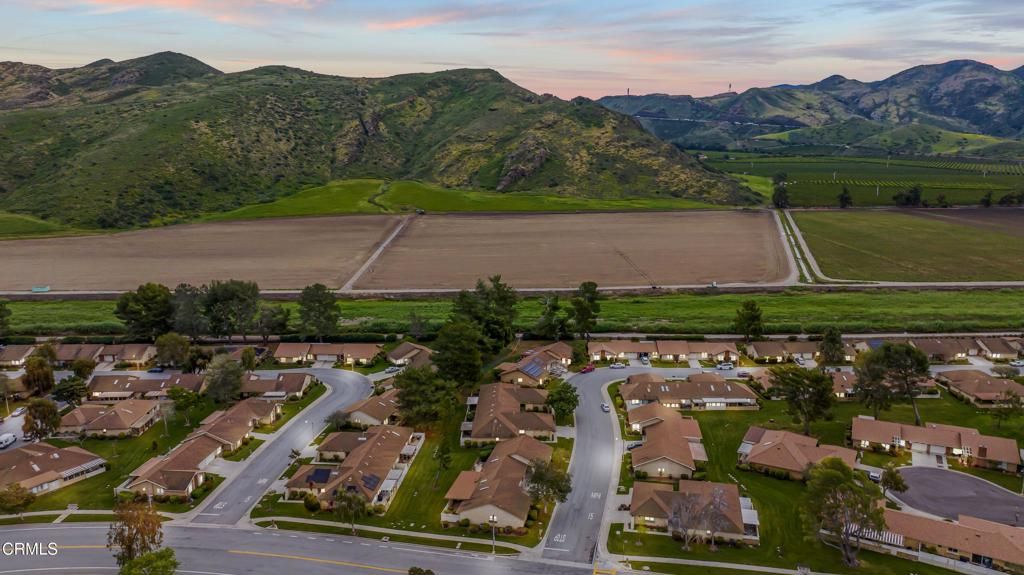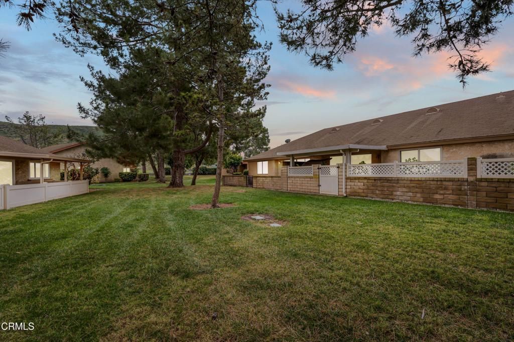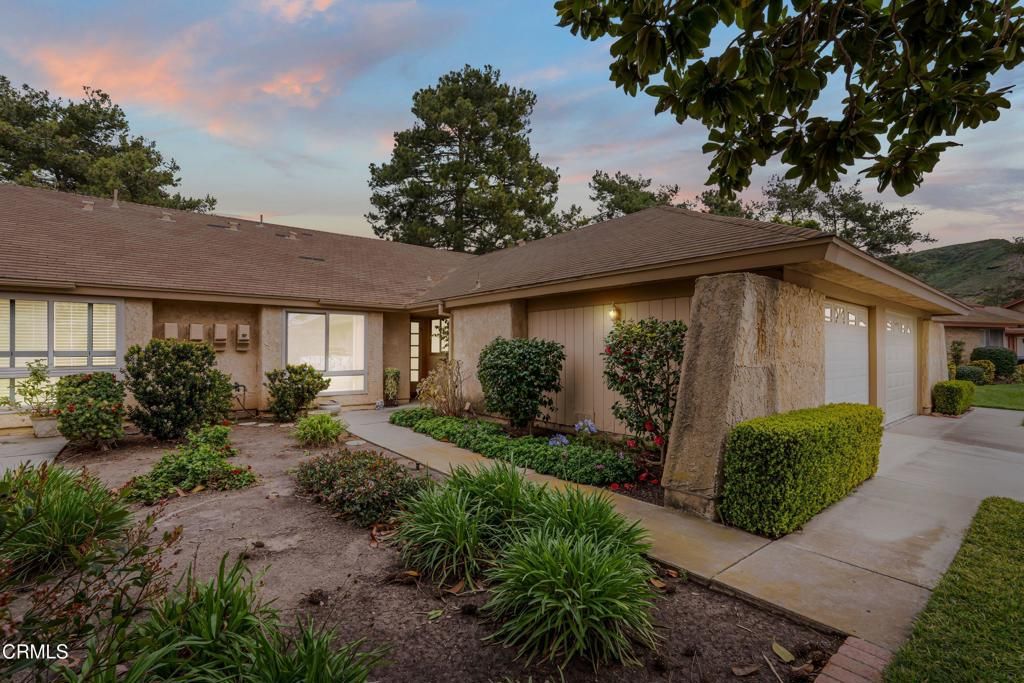 Welcome to this charming 2 bedroom, 2 full bath home located in Leisure Village in Camarillo, a highly desirable 55+ guard gated community known for its secure, low maintenance, and active lifestyle. It offers 1,070 square feet of living space on a 2,178 square foot lot. A beautifully maintained front yard creates wonderful curb appeal. Upon entry, you're greeted by a warm and inviting living room with plush carpeted floors and a sliding glass door leading to the backyard. Adjacent to the living room is a lovely dining area, perfect for gatherings, followed by a classic white kitchen featuring ample white cabinetry, white appliances, elegant quartz countertops, a double sink, and space for a breakfast table. The kitchen also provides direct access to the attached one car garage, which contains the laundry area. Near the front entry are the two bedrooms, including a spacious secondary bedroom with a generous closet and a full hallway bath. The primary suite offers its own private bathroom with a marble sink, a bathtub and shower, and a large mirrored closet. The backyard is ideal for entertaining, featuring a covered patio area for family gatherings and additional green space to enjoy outdoor living.