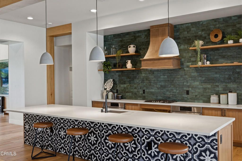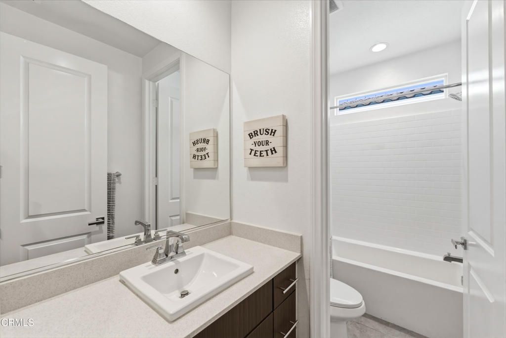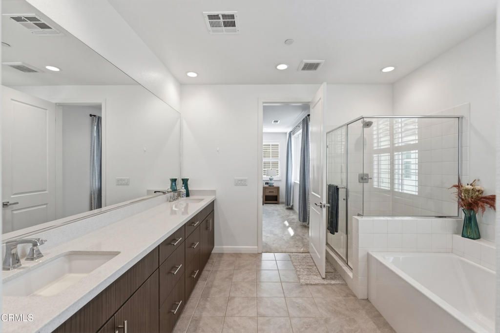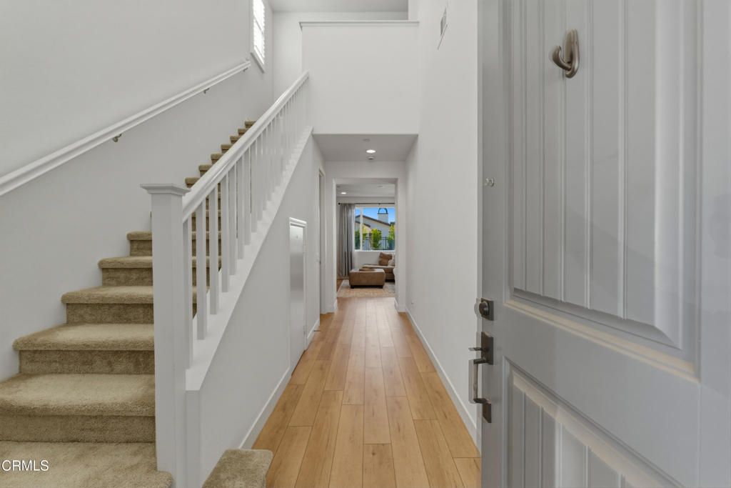 Welcome to the newly constructed Anacapa Canyon neighborhood in Camarillo. Completed in late 2023, this stunning 3-bedroom, 2.5-bath, 1,708 sq ft home offers an exceptional opportunity for first-time homebuyers or seasoned Camarillo residents seeking modern finishes, a spacious backyard, and expansive scenic views. Upon entering, you're welcomed by tall ceilings and luxurious wood-style vinyl plank flooring that leads into a beautifully designed living room, featuring a custom-built entertainment unit with built-in cabinetry, striking electric fireplace framed by a modern wood mantel, floating shelves, and board-and-batten accents. The open-concept kitchen showcases contemporary gray cabinetry and quartz countertops and stainless-steel LG ThinQ smart appliances, including a gas range, oven, microwave, refrigerator and dishwasher. A large center island comfortably seats four, with the kitchen positioned to take advantage of beautiful backyard views. The space also includes a designated dining area and a large sliding glass door for effortless indoor-outdoor living. Upstairs, the spacious primary suite offers a serene retreat with a bright white bathroom featuring an oversized shower, soaking tub, separate toilet area, dual sinks and a massive walk-in closet. Two additional bedrooms and bathroom are located down the hall, along with a large laundry room and linen storage. Additional highlights include white plantation shutters throughout, modern square-edge baseboards, a Honeywell Home Pro Series smart thermostat, and a beautifully landscaped grass backyard with rear hedges for added privacy. Residents enjoy luxury community amenities, including an expansive resort-style pool and two jacuzzis, kids' pool, playground, lounge areas with firepits, a fully equipped fitness center with a kids' area, covered patio spaces with BBQs, and an impressive clubhouse featuring a modern kitchen, pool table, shuffleboard, coffee/cappuccino machine, business/work area, and spacious entertainment areas with TVs, couches, tables, etc. Owners also have access to two additional pools and clubhouses in the University Glen community, along with two parks, designated dog park, basketball court and large greenbelt. This serene and thoughtfully designed neighborhood delivers luxury living with exceptional amenities. It also offers the rare opportunity to own a 2023-constructed home with a spacious backyard, an increasingly uncommon feature in newer Camarillo developments.