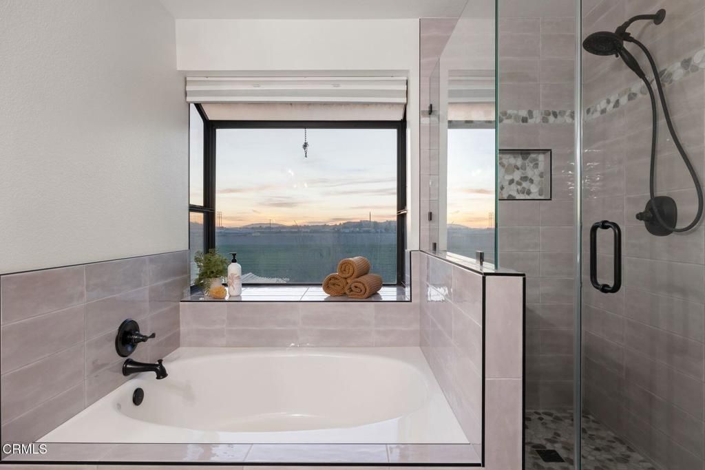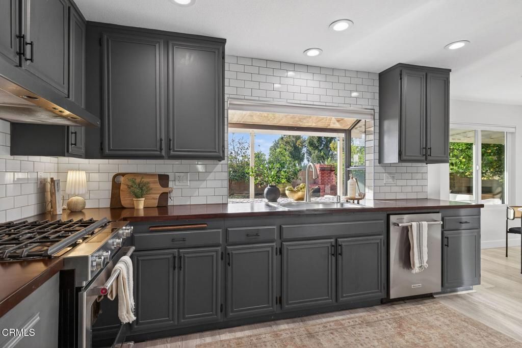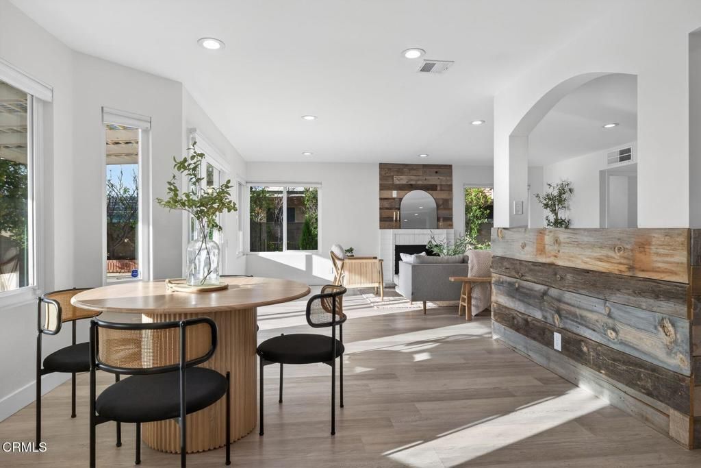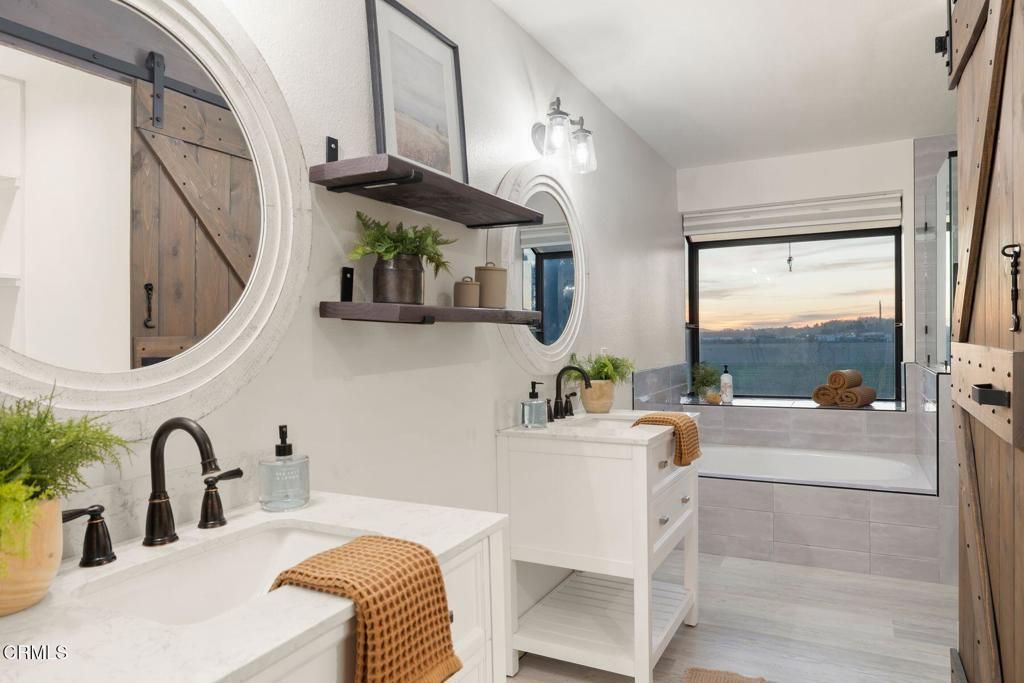 Set against the tranquil backdrop of open farmland with no rear neighbor, this stunning 2,700+sf South Moorpark residence offers the rare blend of privacy, and elevated living. Endless skies & breathtaking sunset views create a daily masterpiece right from your own backyard. Beyond its alluring curb appeal & meticulous landscape, the home's light-filled interior welcomes you with soaring ceilings, and an expansive open layout- offering two spacious living areas, each anchored by their own fireplace. A formal dining room provides the perfect setting for elegant dinners, while the beautifully updated kitchen opens seamlessly to an additional casual dining nook, ideal for morning coffee or sunset meals. The spacious kitchen is complete with ample storage space, new stainless appliances, butcher block counter tops, gas range, wine fridge and a large bay window to welcome mountain views and stunning sunsets. Step outside to the backyard where a spacious covered patio sets the stage for year-round outdoor living. The full perimeter of mature fruit trees (apples, oranges, guava, pomelo and multiple citrus) creates a lush orchard-like setting--while tall ficus hedges provide additional privacy and a rich green backdrop. Fully plumbed for both an above ground pool and hot tub, the space provides endless possibilities for outdoor fun. Upstairs, the home features all four spacious bedrooms and two additional fully renovated baths- ideally keeping living areas downstairs, while maintaining privacy and separation above. The massive primary suite is a true retreat- a sanctuary with generous proportions, abundant natural light, and a beautifully updated bath with dual vanities, soaking tub, large shower, walk-in closet, and exceptional birds eye views of the serene farmland below. Down the hall are three additional bedrooms, and fully updated guest bath with walk in shower. Countless highlights include all newer dual pane windows with privacy shades throughout, recessed lighting, laminate flooring, central air conditioning, fully owned Brinks alarm system with security cameras and doorbell camera, and multiple eero wifi extenders. Large THREE-car attached garage provides ample storage and parking, plus TWO Tesla brand EV car chargers! Relish in the luxury of this modern and move-in ready home, while only minutes to parks, great schools, restaurants, shopping, and all that beautiful Moorpark has to offer!