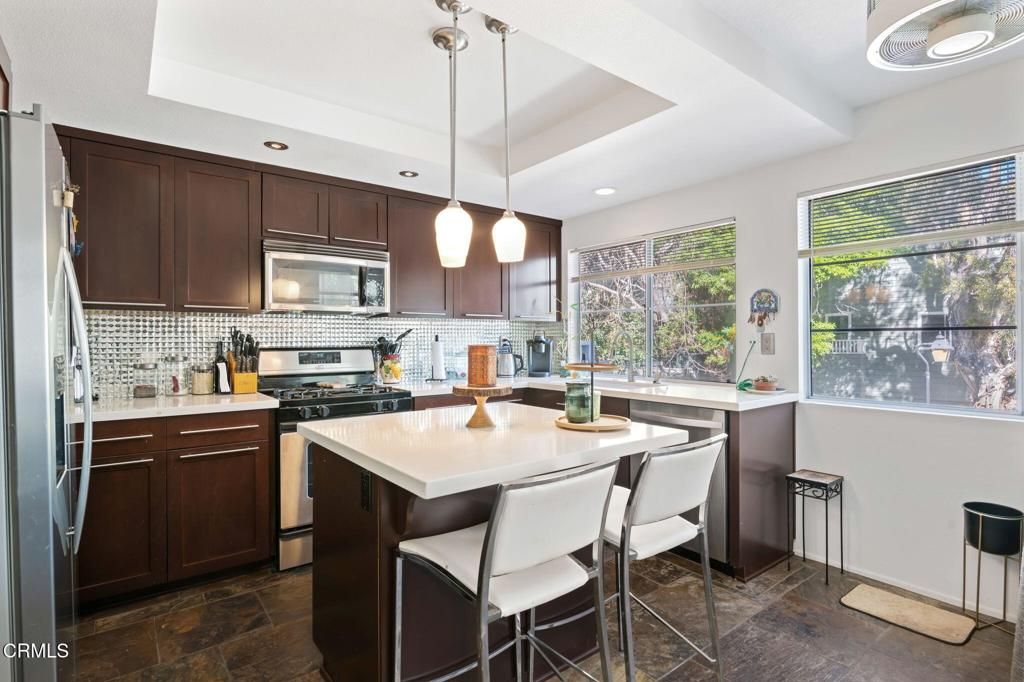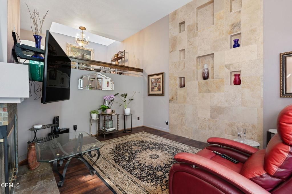 Beautifully upgraded from original. Hardwood, stone and carpeted floors. Built-in wall display and fireplace in living room. Designer kitchen. Perfect location if you like being close to shopping, restaurants and Ventura County Government Center. Walking/bike path and park nearby.