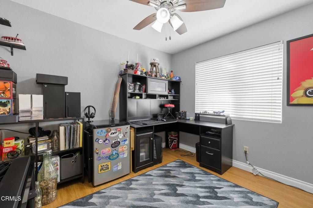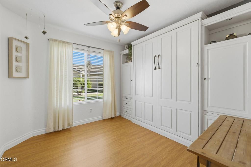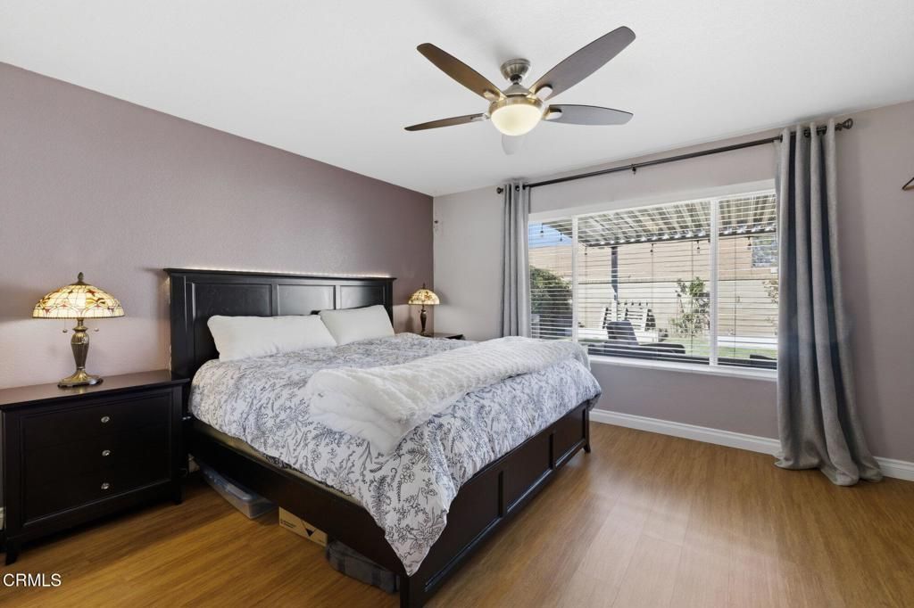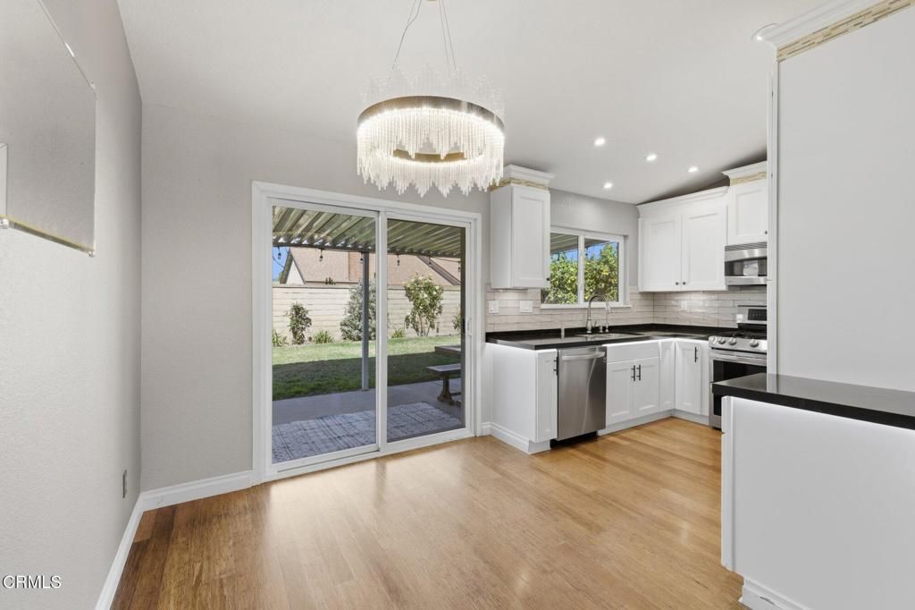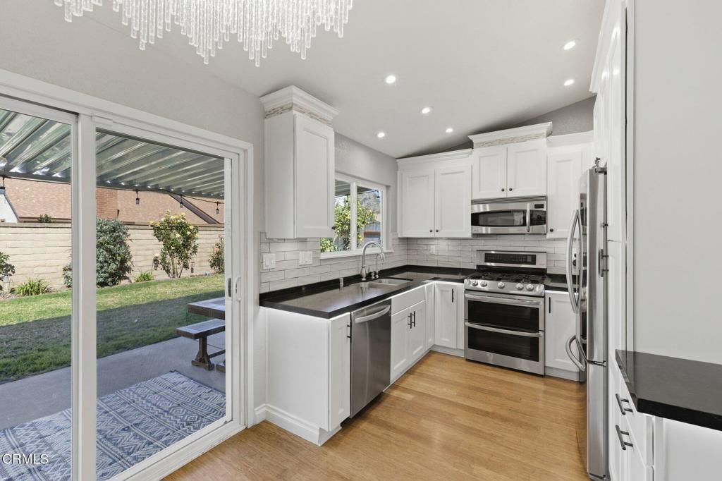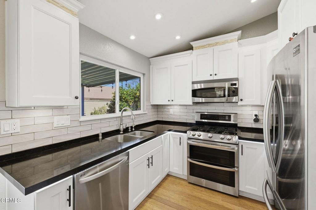 Beautifully upgraded single-level home in the desirable Fairfield community of Mission Oaks in Camarillo. This 3-bedroom, 2-bathroom home offers 1,141 sq ft of bright and comfortable living space with numerous updates throughout. The living room boasts vaulted ceilings and a cozy fireplace with a stacked-stone surround and classic white mantel, creating a warm and inviting focal point, while bamboo flooring flows seamlessly through the kitchen, dining, and living areasThe remodeled kitchen features modern cabinetry, quartz countertops, tile backsplash, stainless steel sink and faucet, range, dishwasher, and under-cabinet and under-counter lighting. Both bathrooms have been thoughtfully updated with tile flooring, quartz countertops, new vanities, high-end fixtures, and marble accents in the bath and shower areas. Bedrooms showcase durable luxury vinyl plank flooringAdditional improvements include an updated heating and air conditioning system, water filtration and conditioning system, roll-up insulated double-walled garage door, and a covered patio perfect for outdoor relaxing or entertainingConveniently located near parks, schools, shopping, and dining, this move-in ready home combines comfort, style, and a prime Mission Oaks location